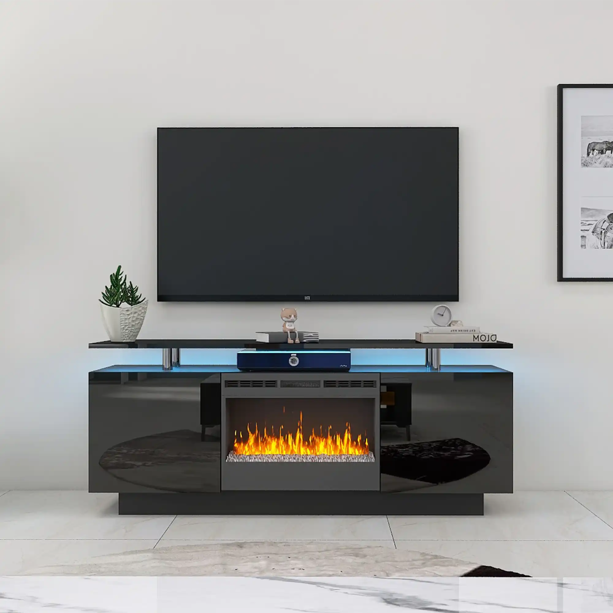 Black Modern Large TV Stand With Fireplace & Heating & LED Light