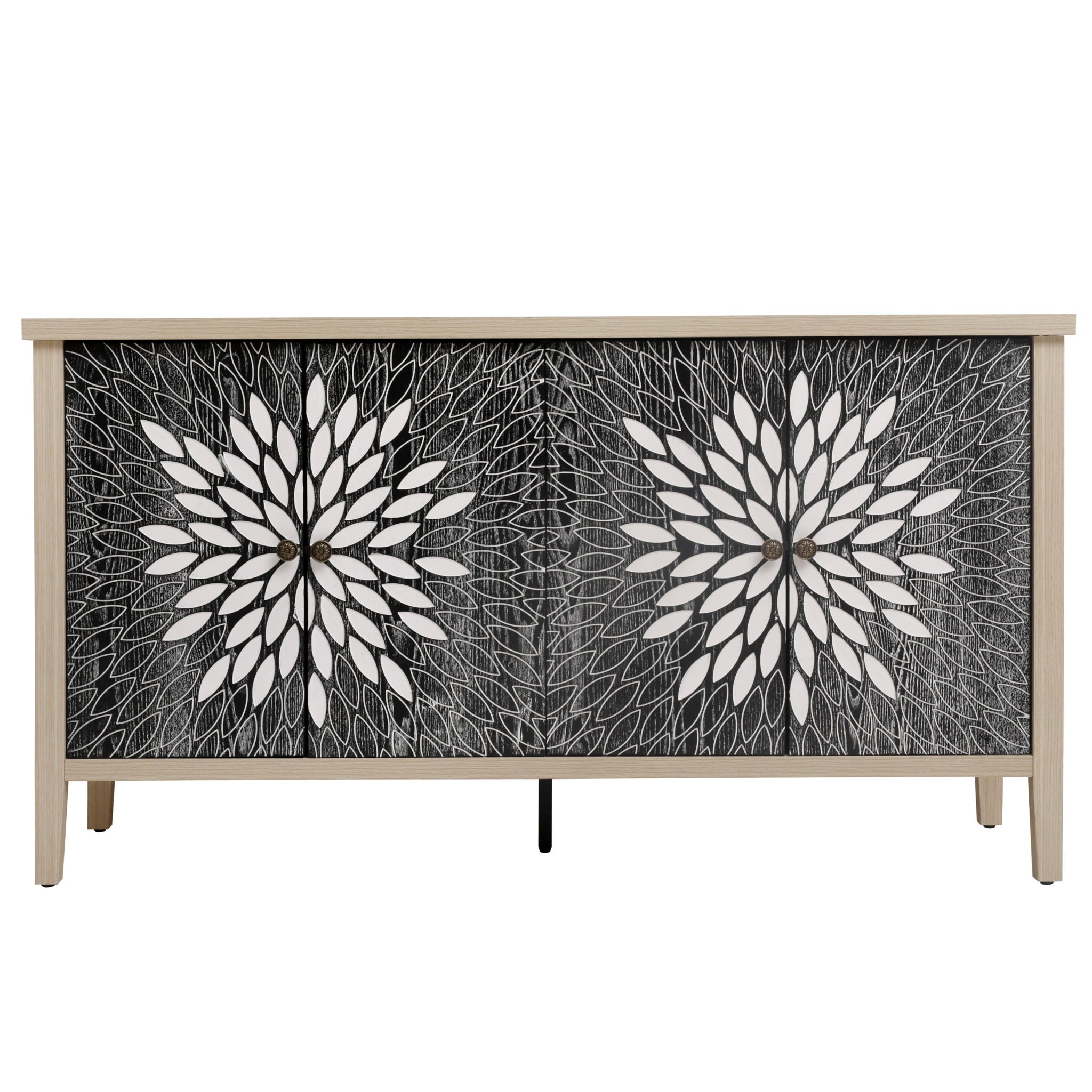 4 Door Sideboard, Carved Sideboard Buffet Cabinet With Storage, Modern Coffee Bar Cabinet With Adjustable Shelf For Living Room, Dining Room, Kitchen - Natural
