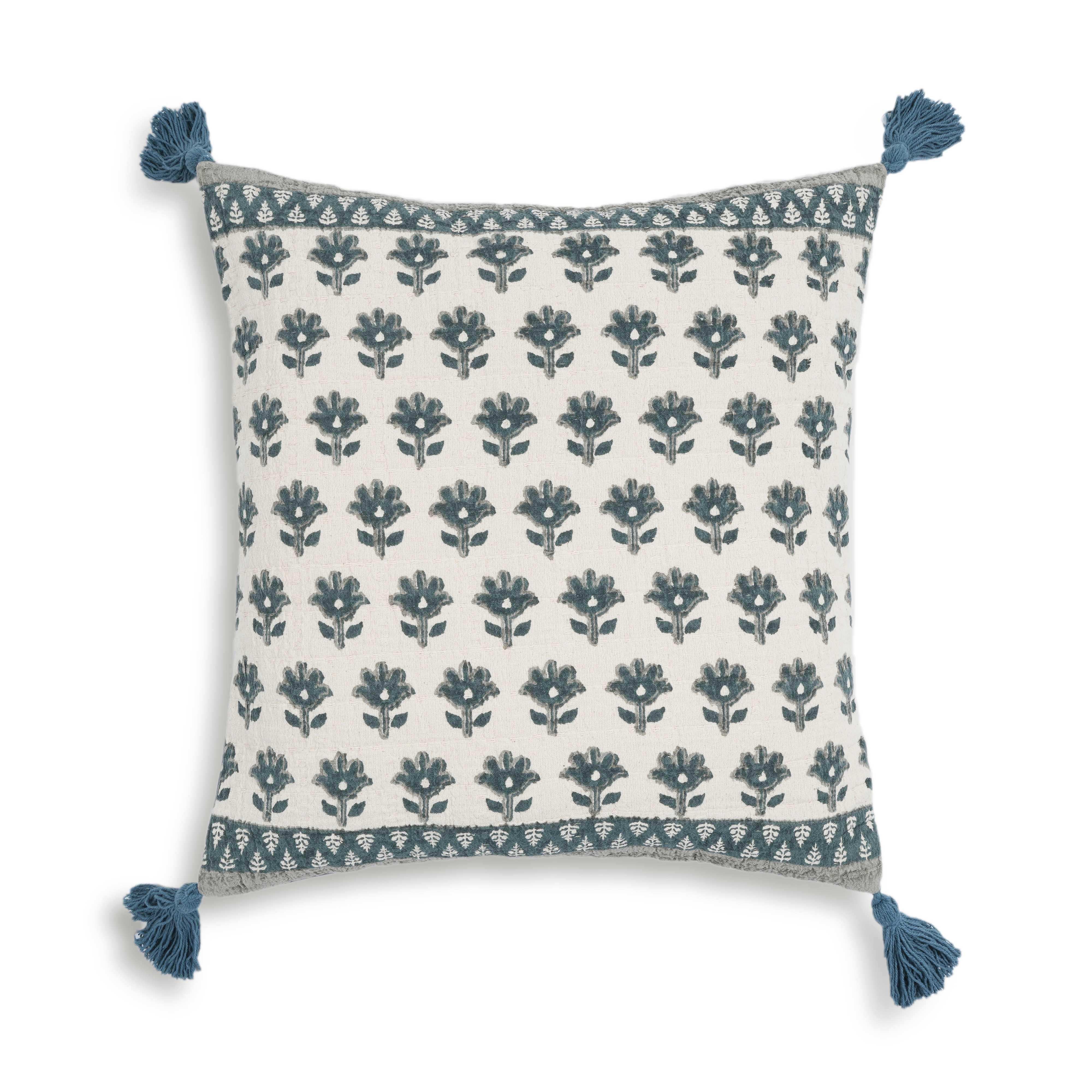 Blossom - 20" Printed Cotton Tassel Accent Cushion - Blue