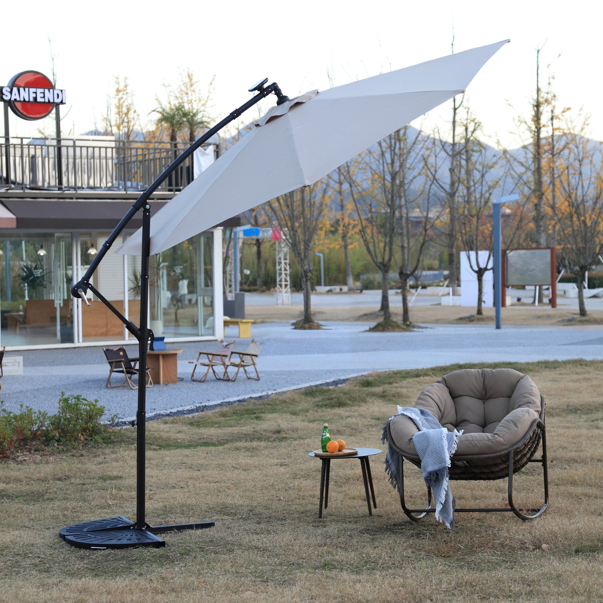 This 10ft solar LED offset hanging market patio umbrella in khaki is designed for outdoor spaces such as gardens and patios. It combines functional shading with integrated solar lighting to enhance your outdoor experience day and night.