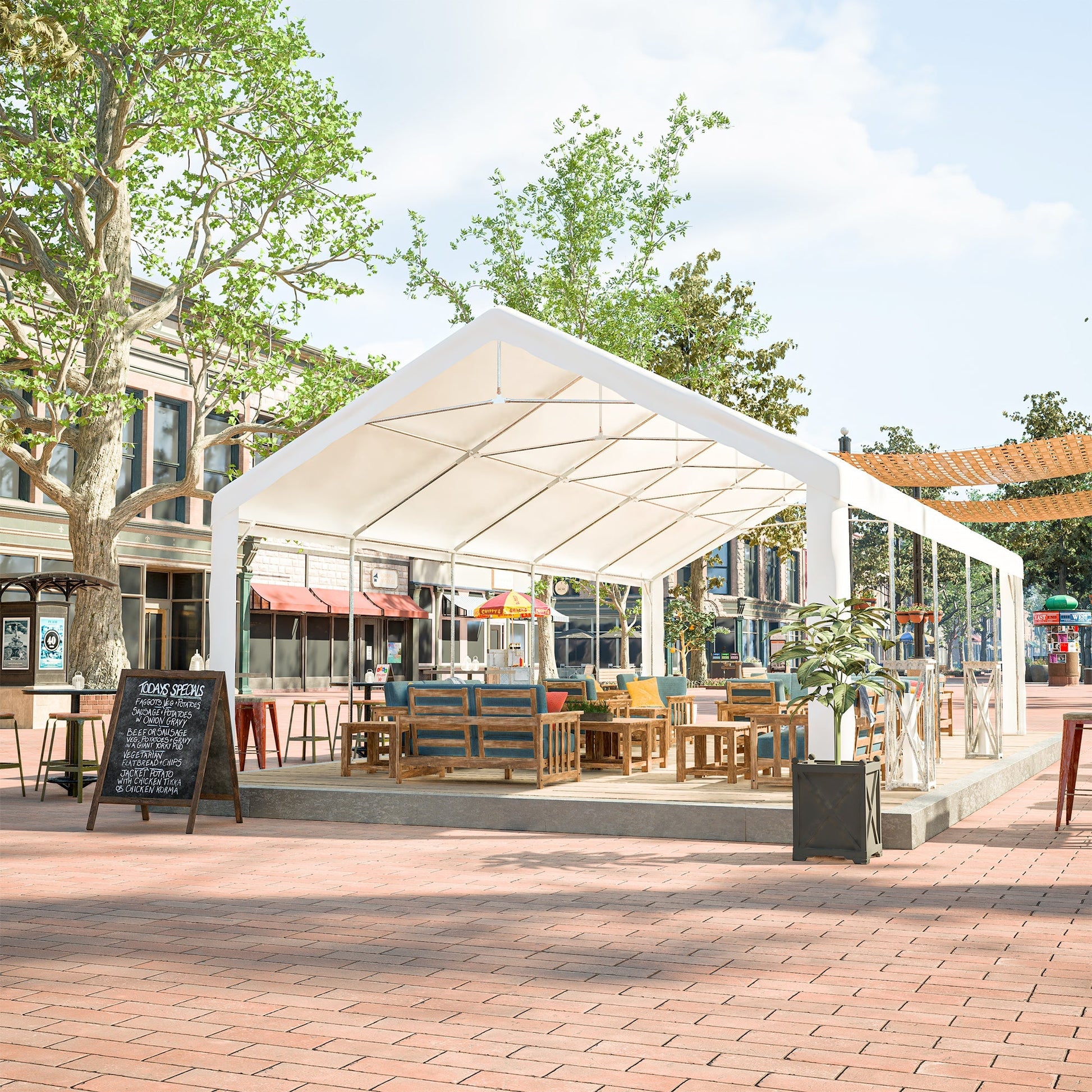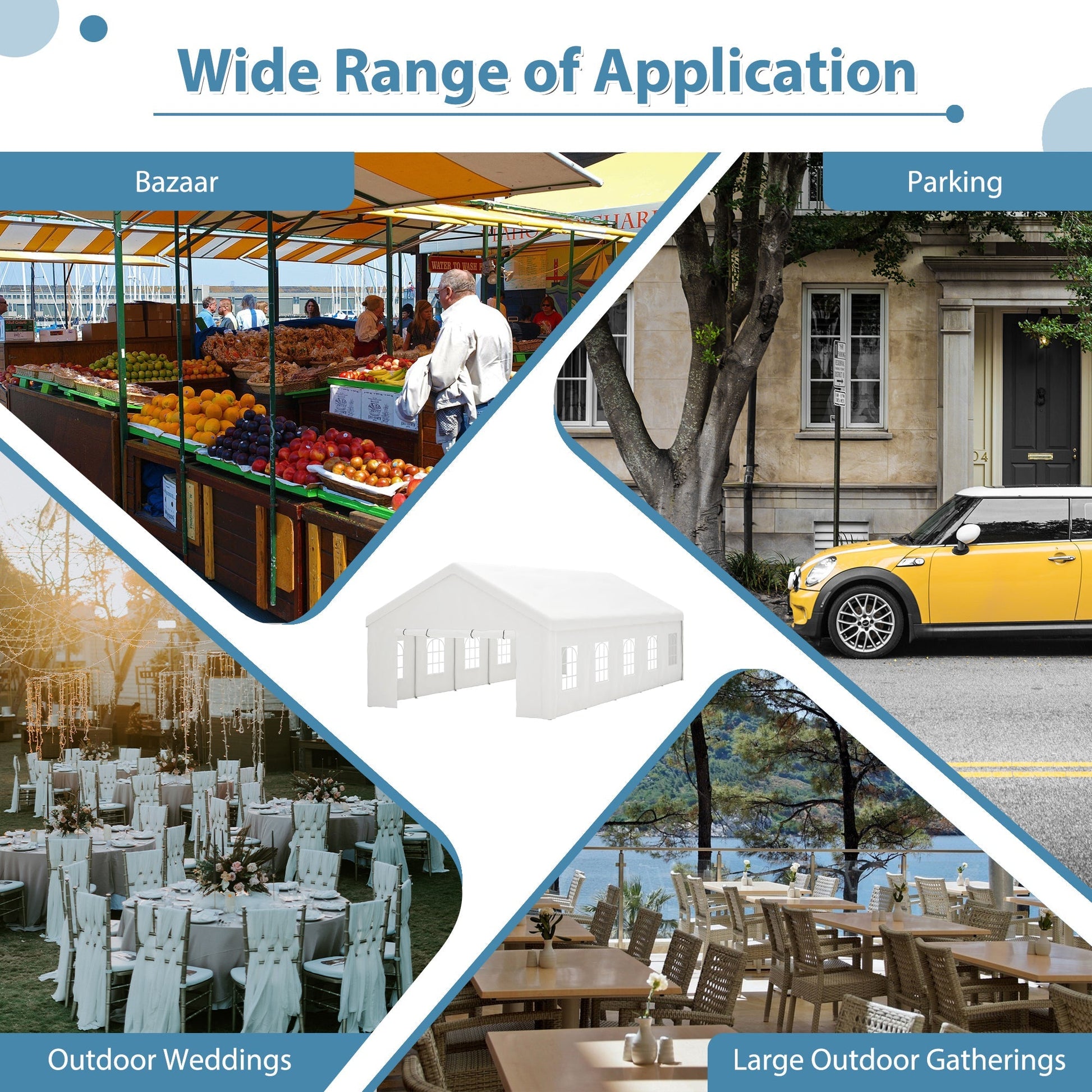 This 16x32FT party tent offers a spacious and durable shelter, perfect for weddings, events, and outdoor gatherings. Its versatile design fits well in gardens, patios, and open outdoor spaces providing reliable protection and style.