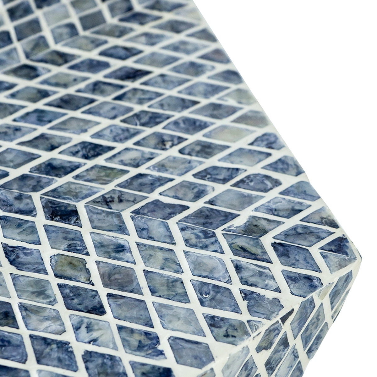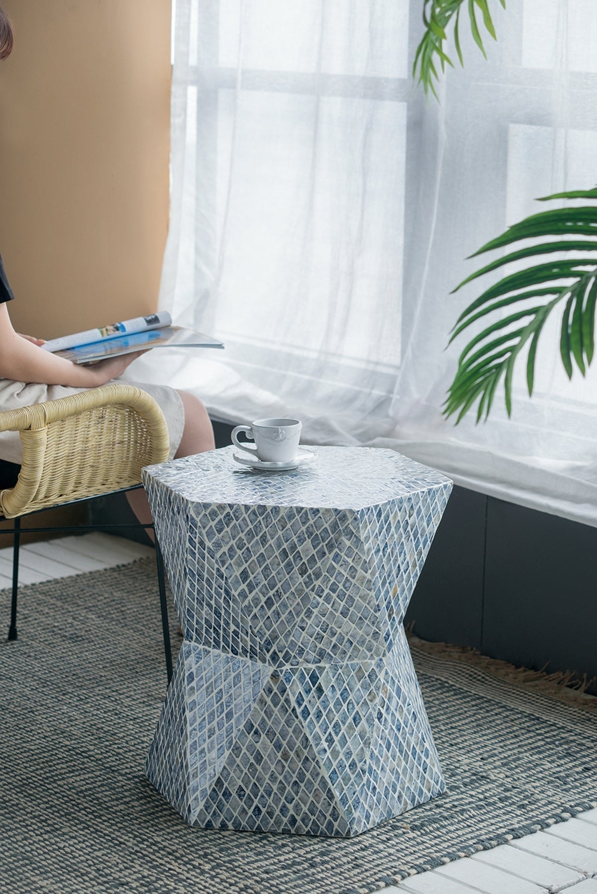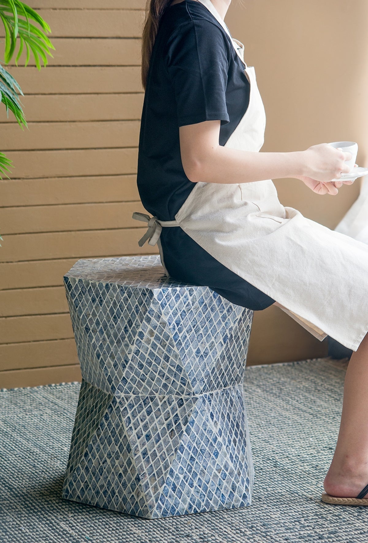 This tapered blue pedestal stool with Capiz inlay serves as a functional and stylish accent side table, ideal for entryways, bedrooms, or living rooms.