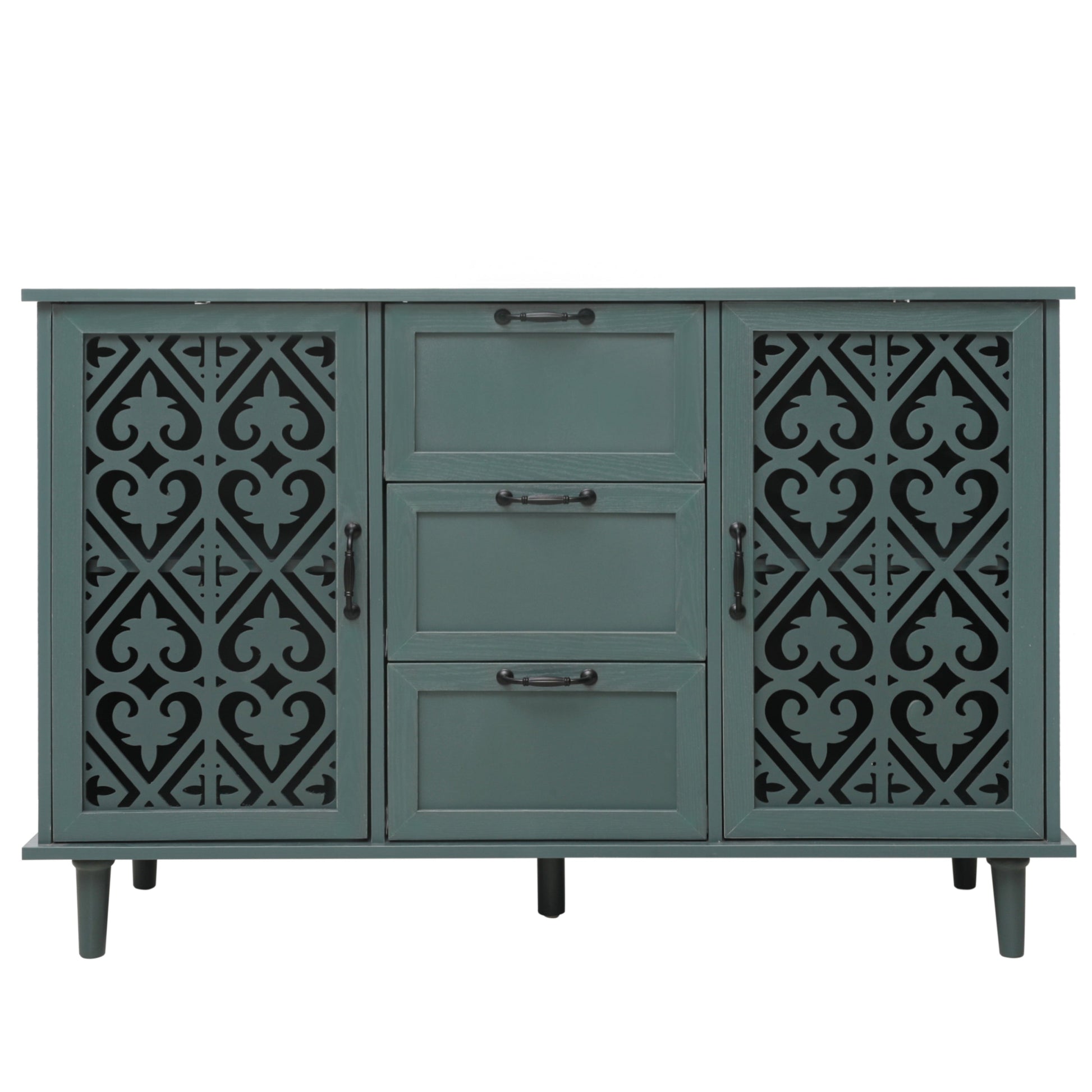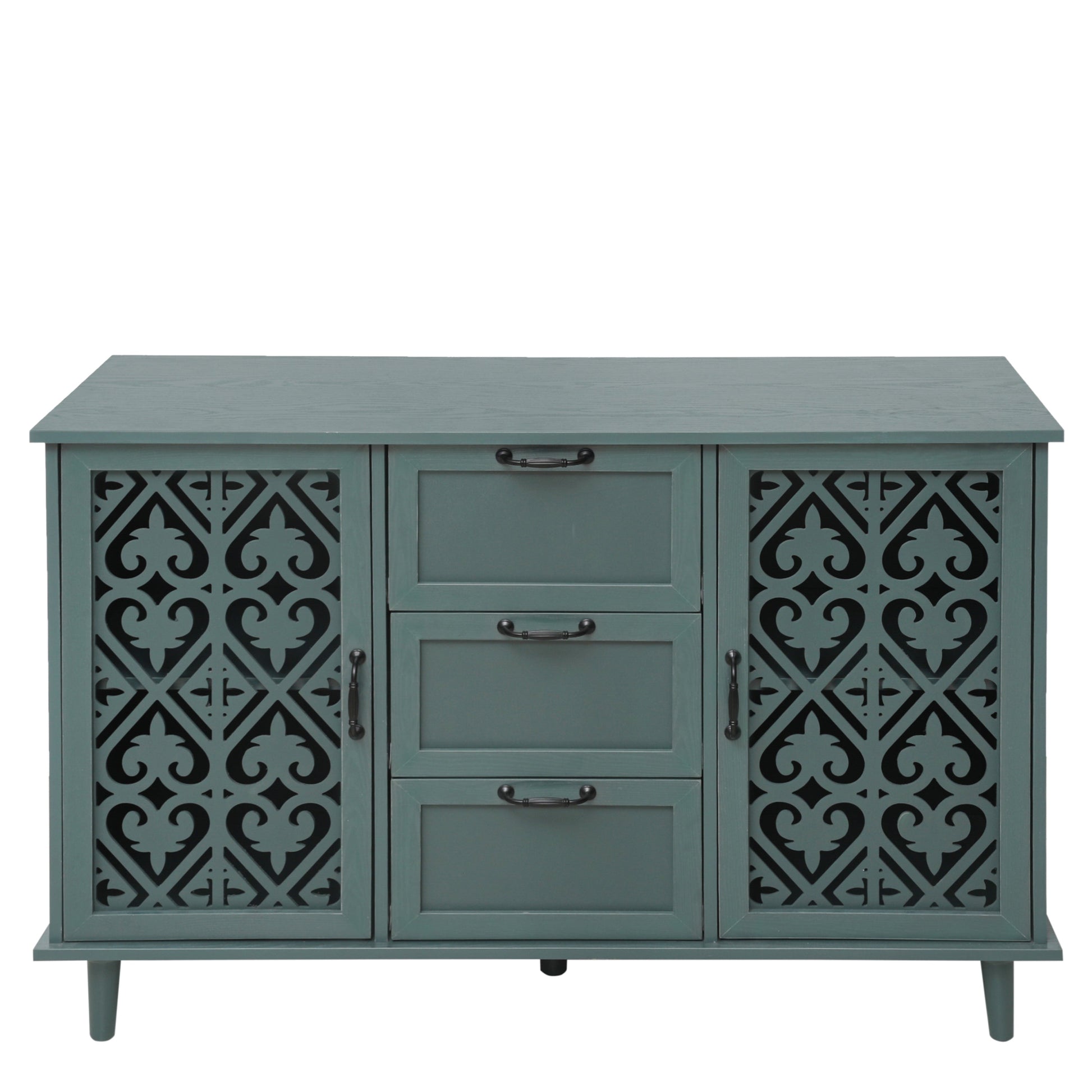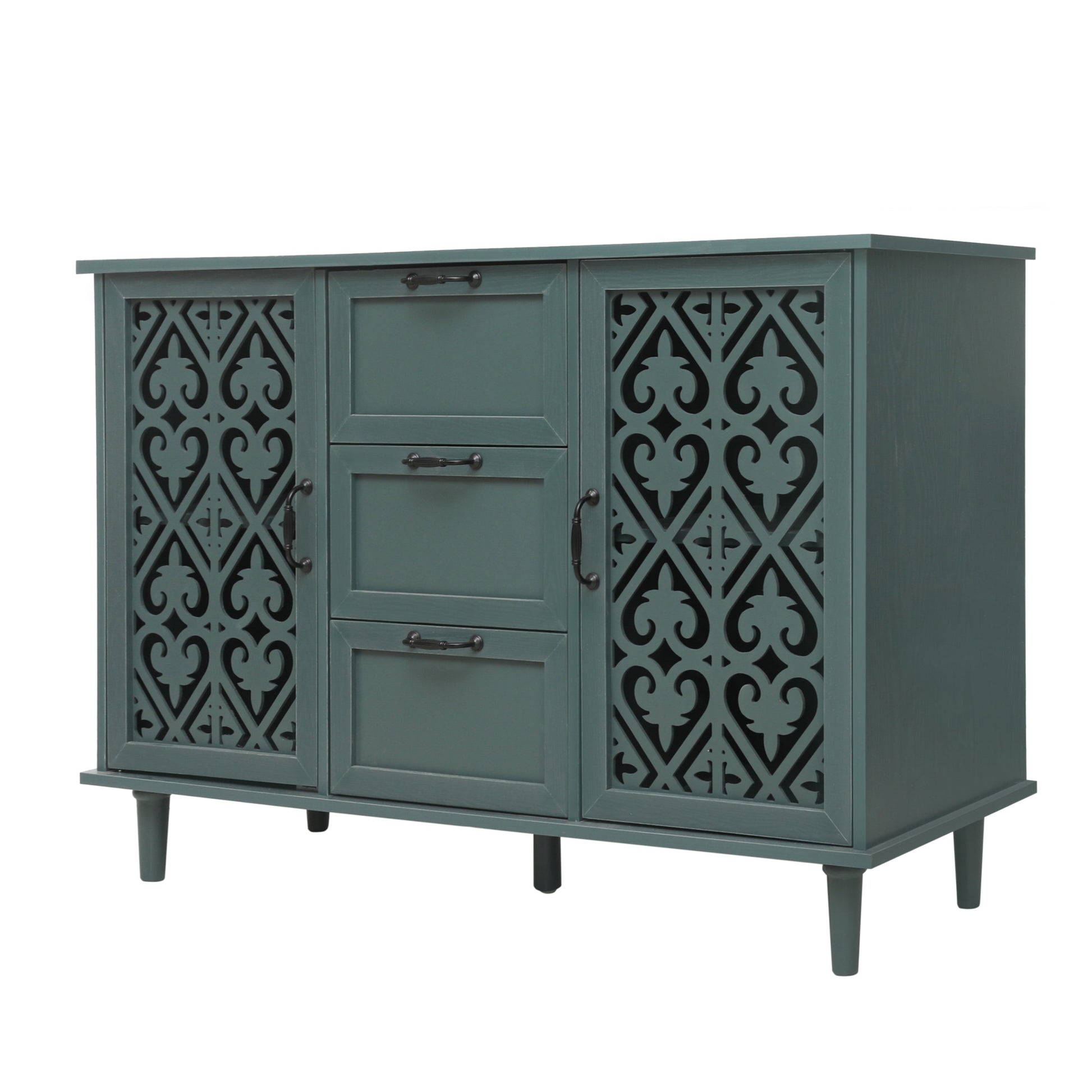 - Decorative carved door panels providing attractive detail and air permeability