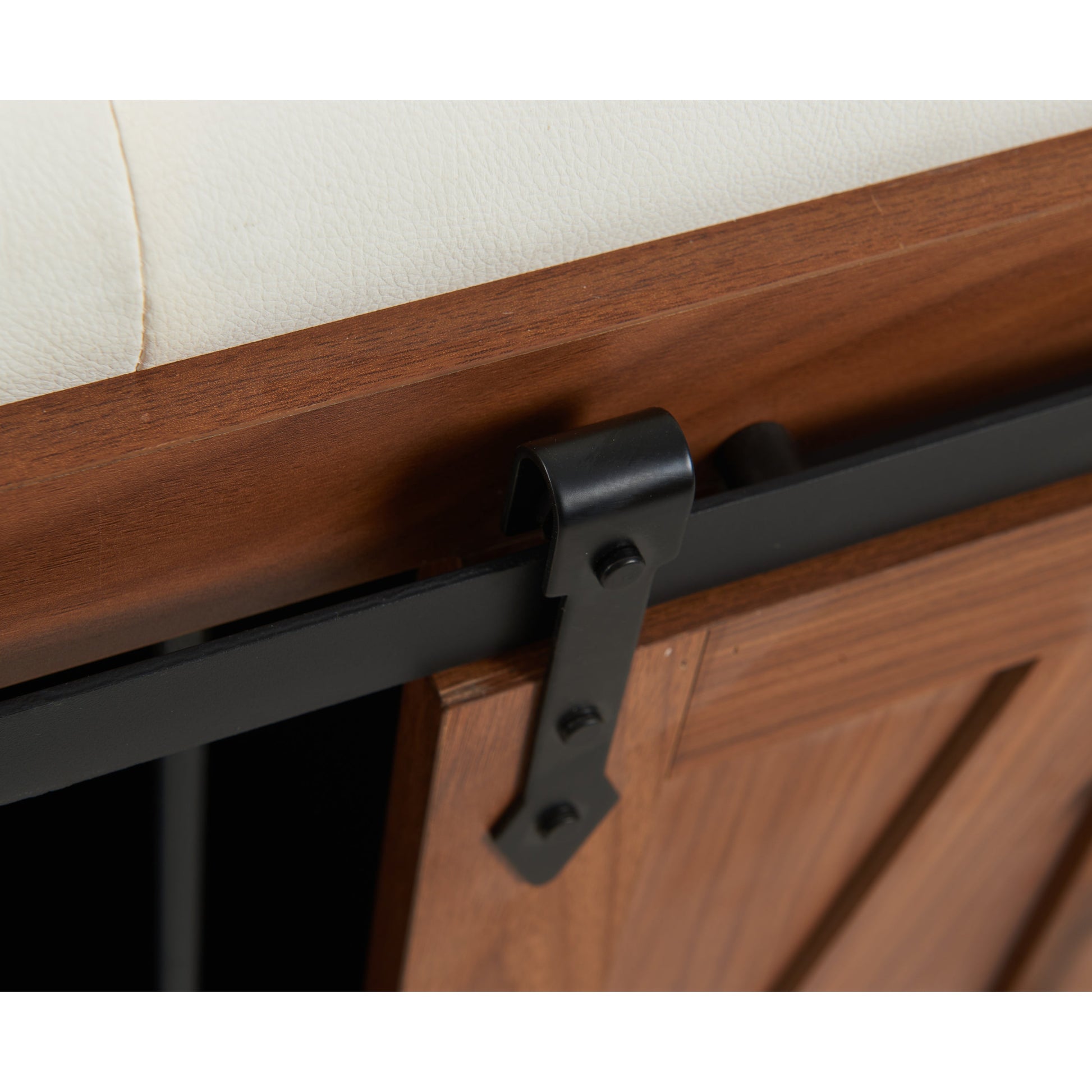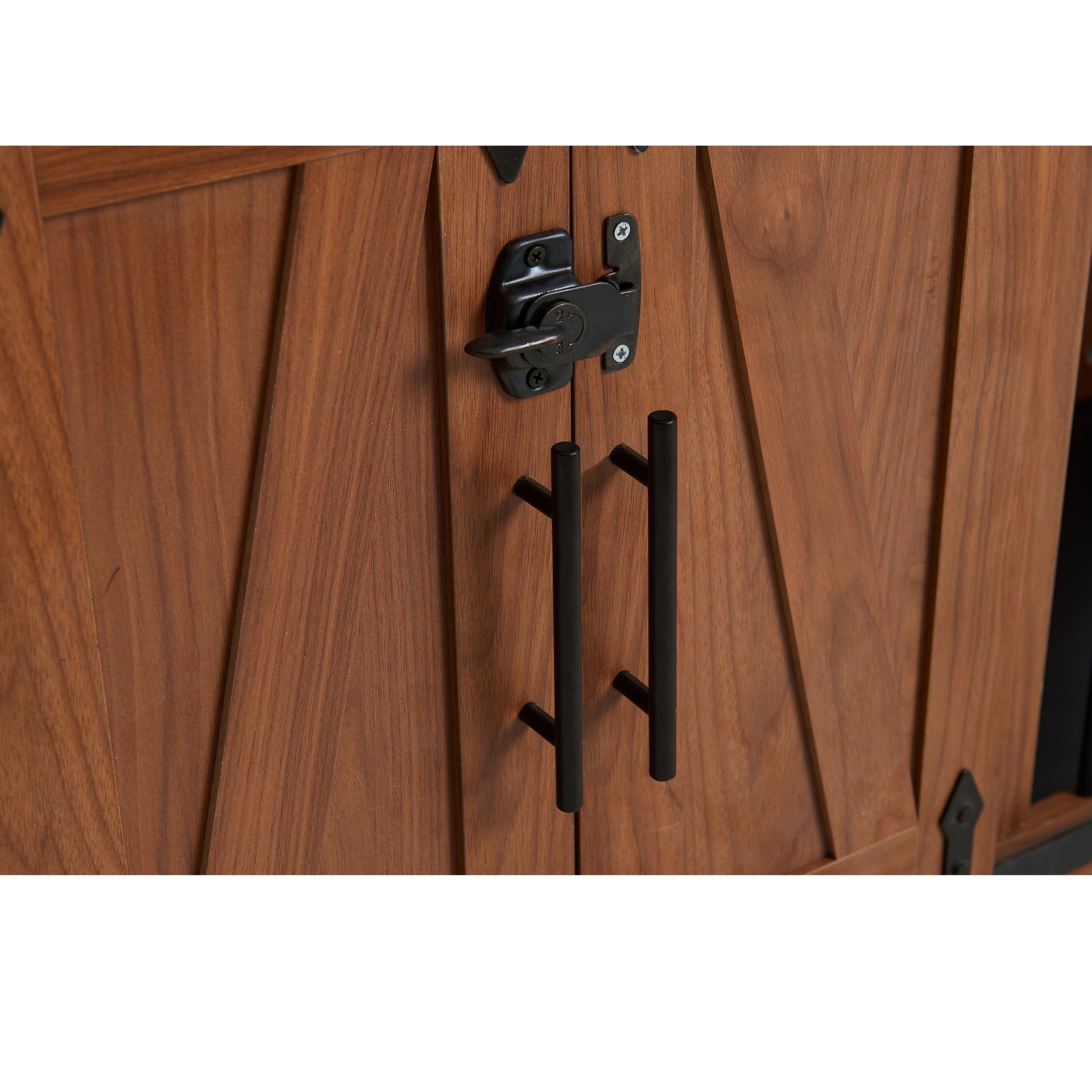 - Sliding barn door with black metal locks and handles for easy access