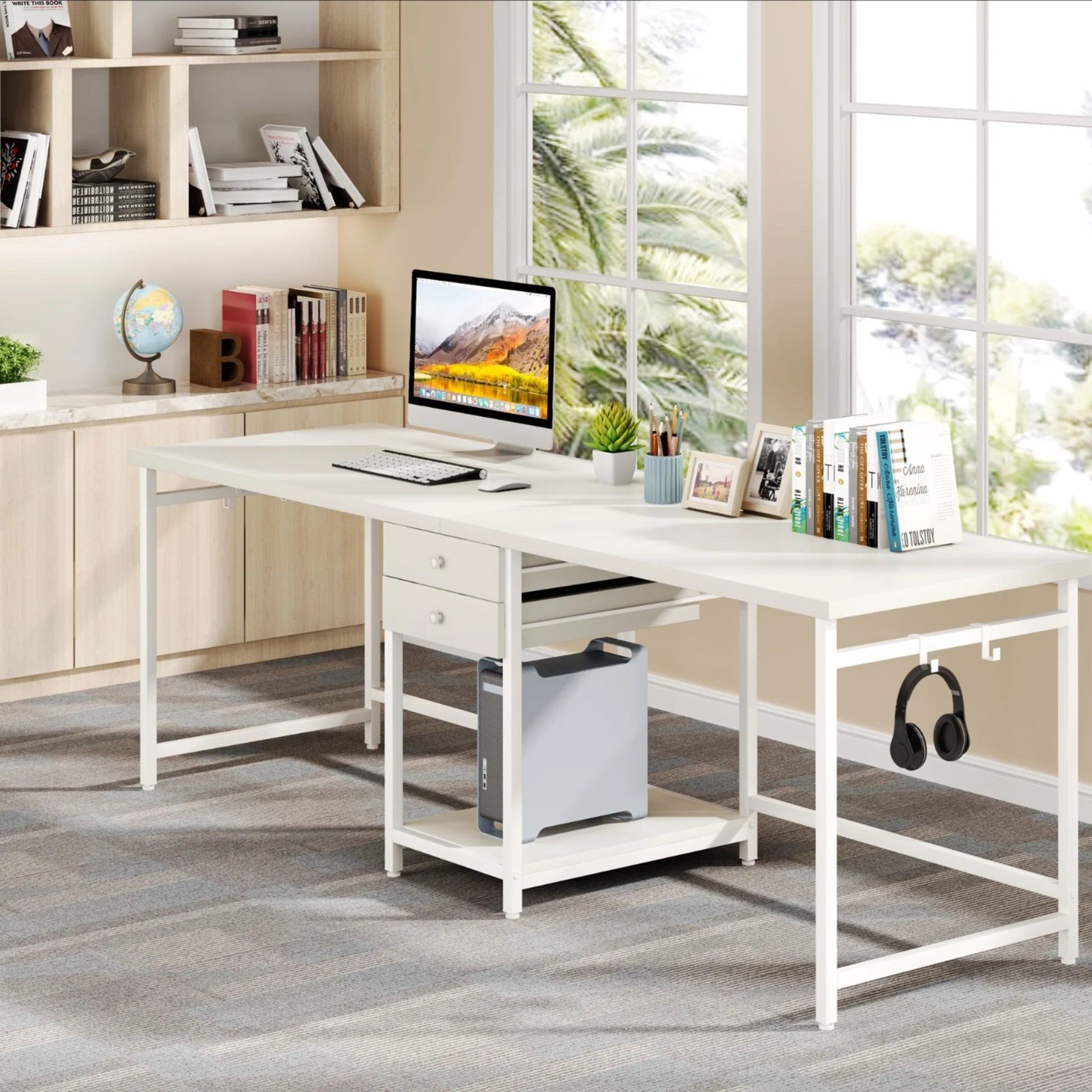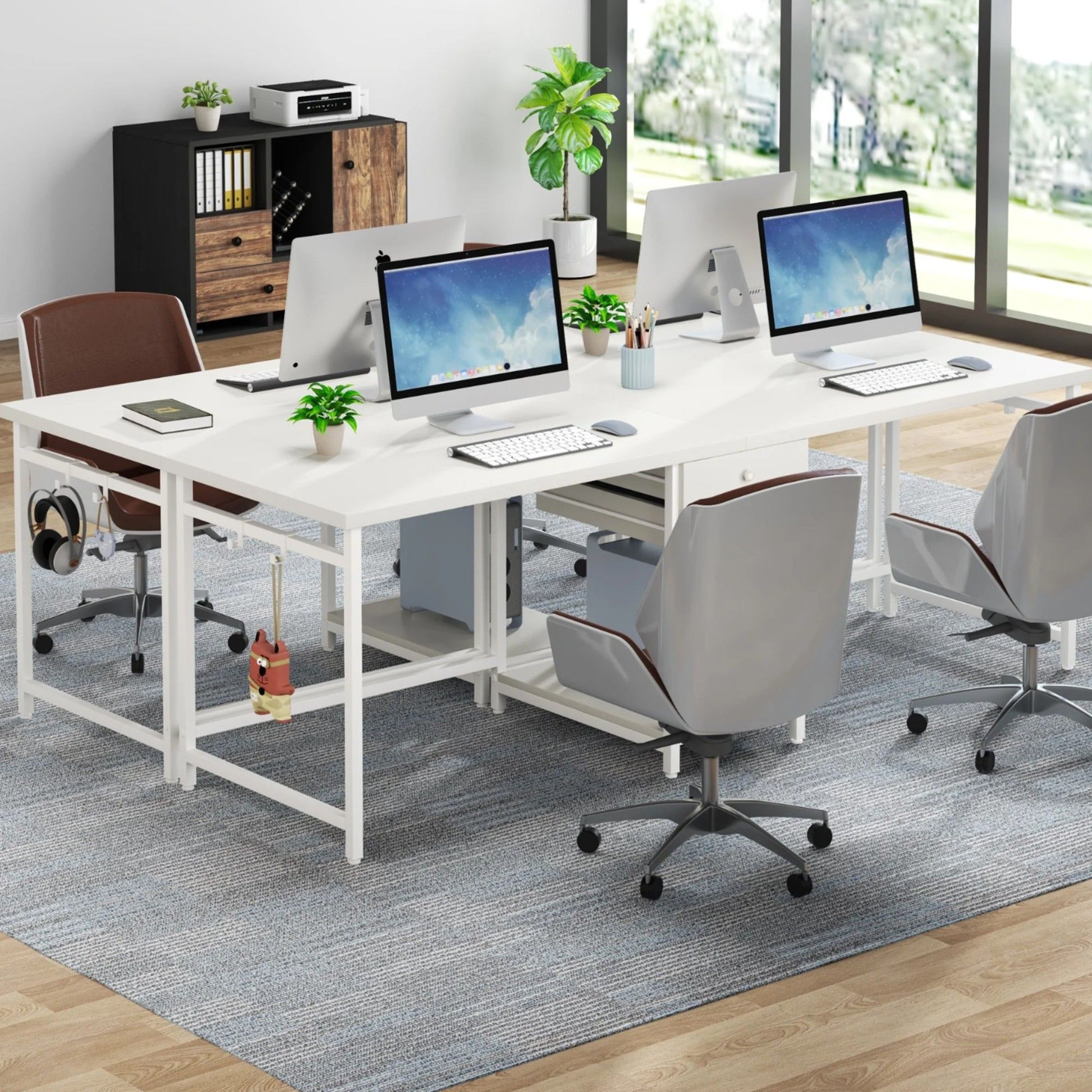 2 Person Computer Desk With Drawers And Shelves, Extra Long Workstation Table With Hooks Construction - White
