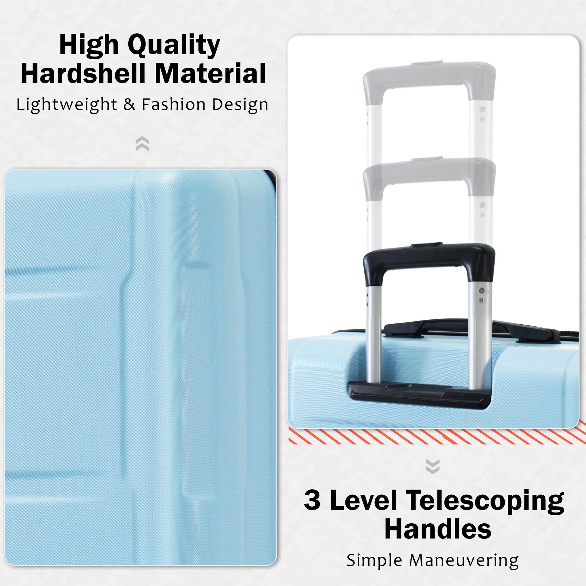 Easy travel : Each piece of luggage is fitted with quad smooth-glide base 360 degree swivel spinner wheels for easy transportation through terminals, on concrete, cobblestone and more.3-step telescoping handle also allows you to maneuver in tight spaces and provide effortless movement.