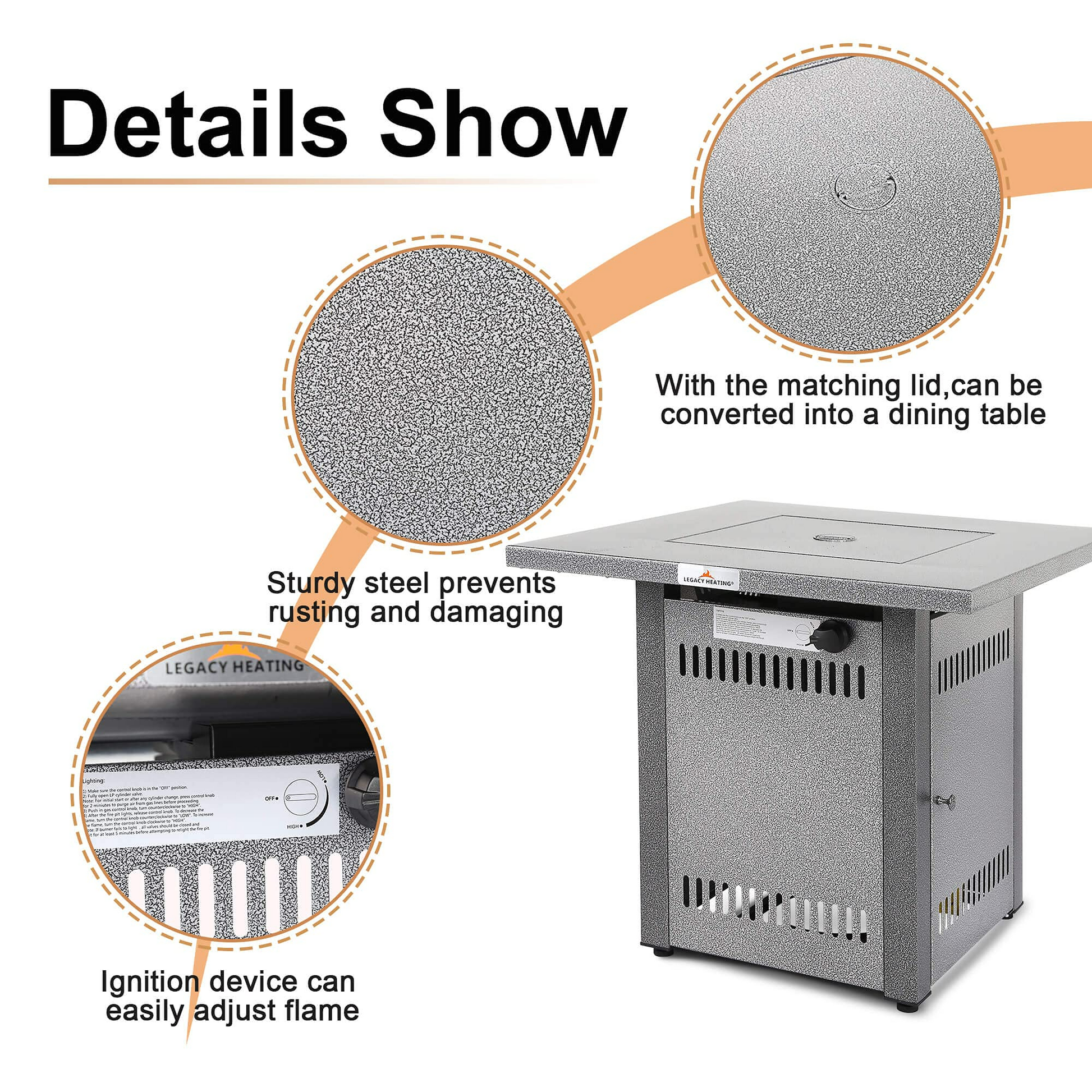 - Dual functionality as both a fire pit and dining table