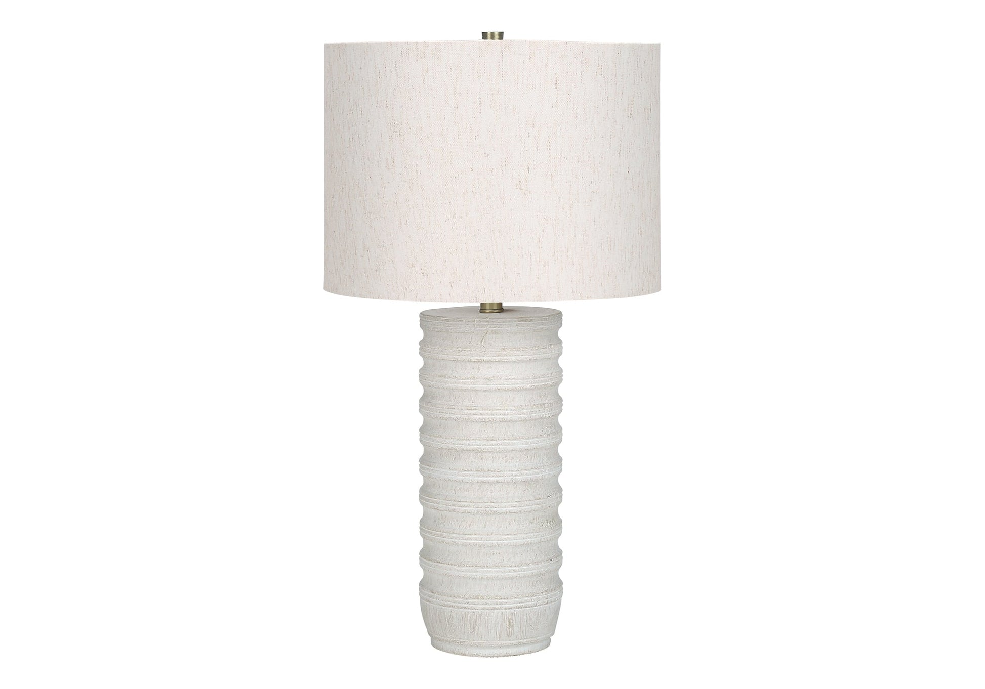 This 28"h table lamp features a cream resin base with a textured, ridged design, ideal for living rooms, bedrooms, or offices. Its transitional style offers a blend of function and elegance to complement various decor settings.
