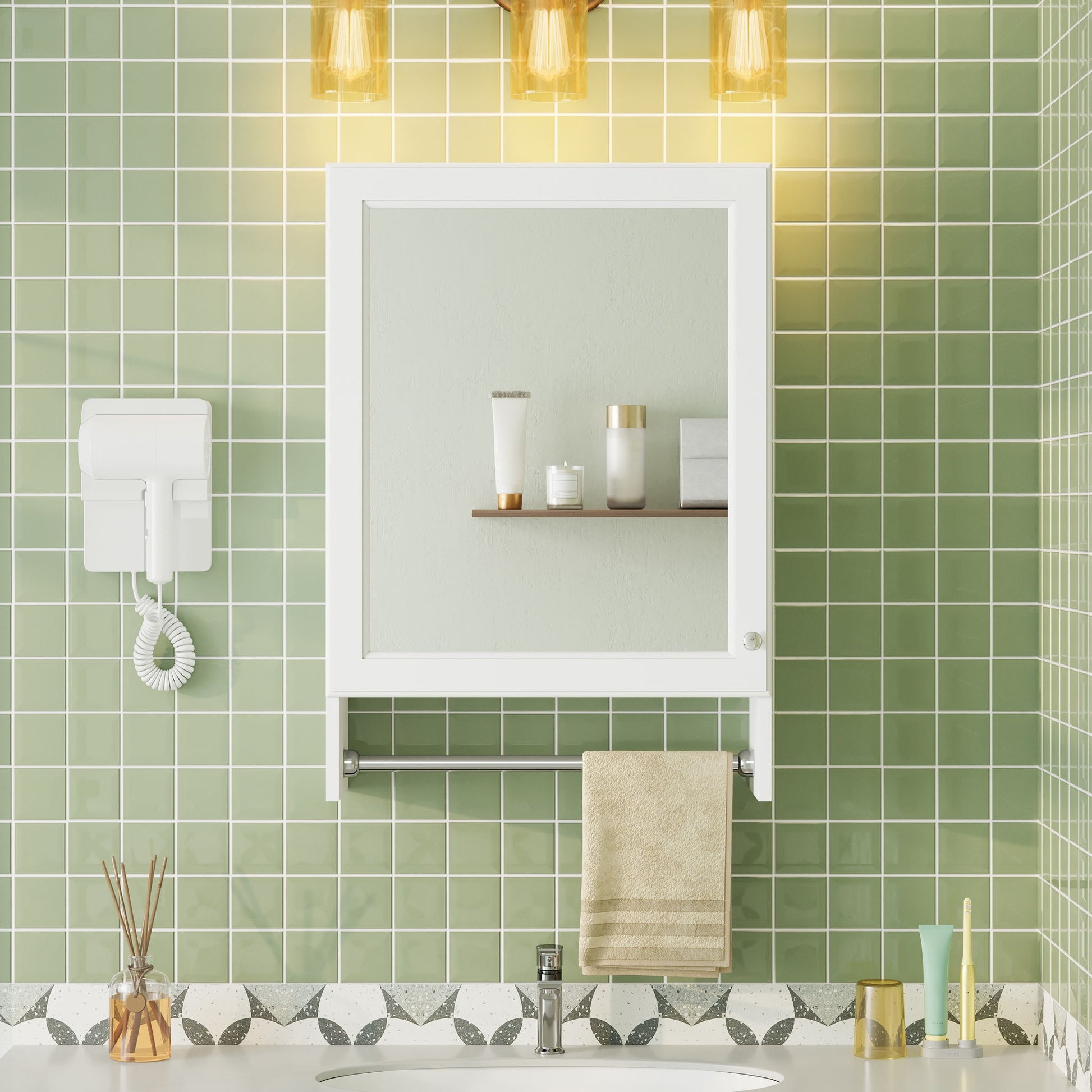 3 In 1 Wall Mounted Bathroom Mirror Cabinet With Adjustable Shelf, Soft Close Door, Mirror & Towel Bar - White