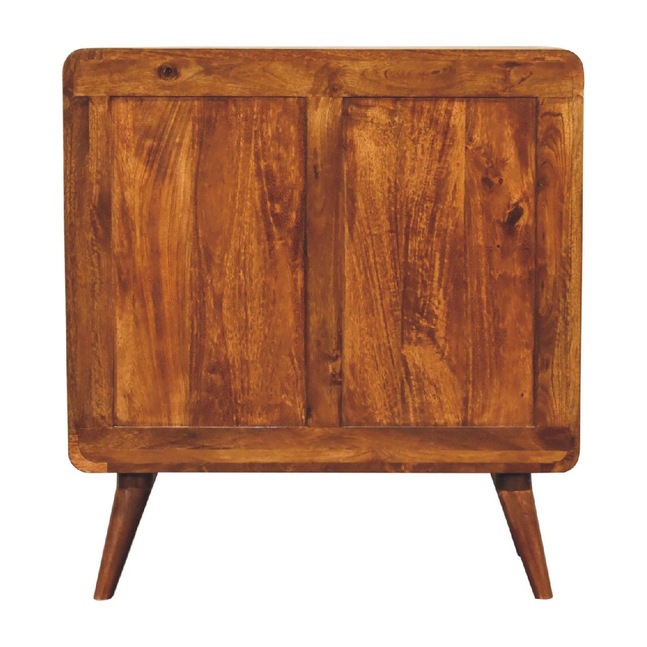 - Solid wood 3 over 2 Curved Chestnut Chest - To match the other products from the curved collection, this 3 over 2 chest of drawers has been constructed from 100% solid mango wood in a rich chestnut finish and stands on 4 Nordic style legs. It features shiny accent knobs on each drawer providing easy access when storing any clothes, towels, duvets, etc. The curved design provides smooth, safe corners and gives the product a modern and contemporary look which is perfect for city homes and apartments.