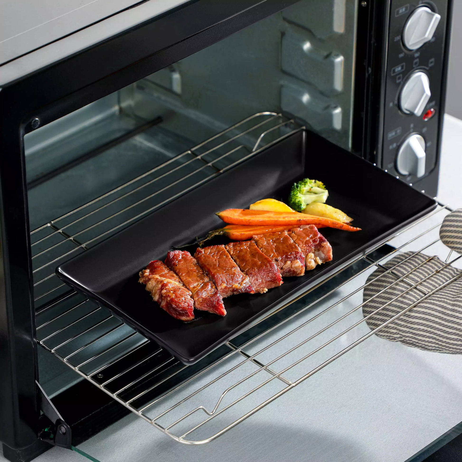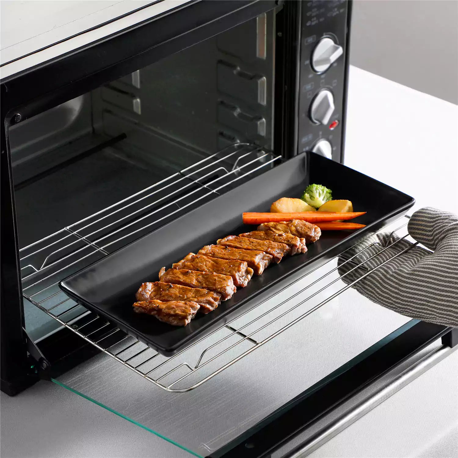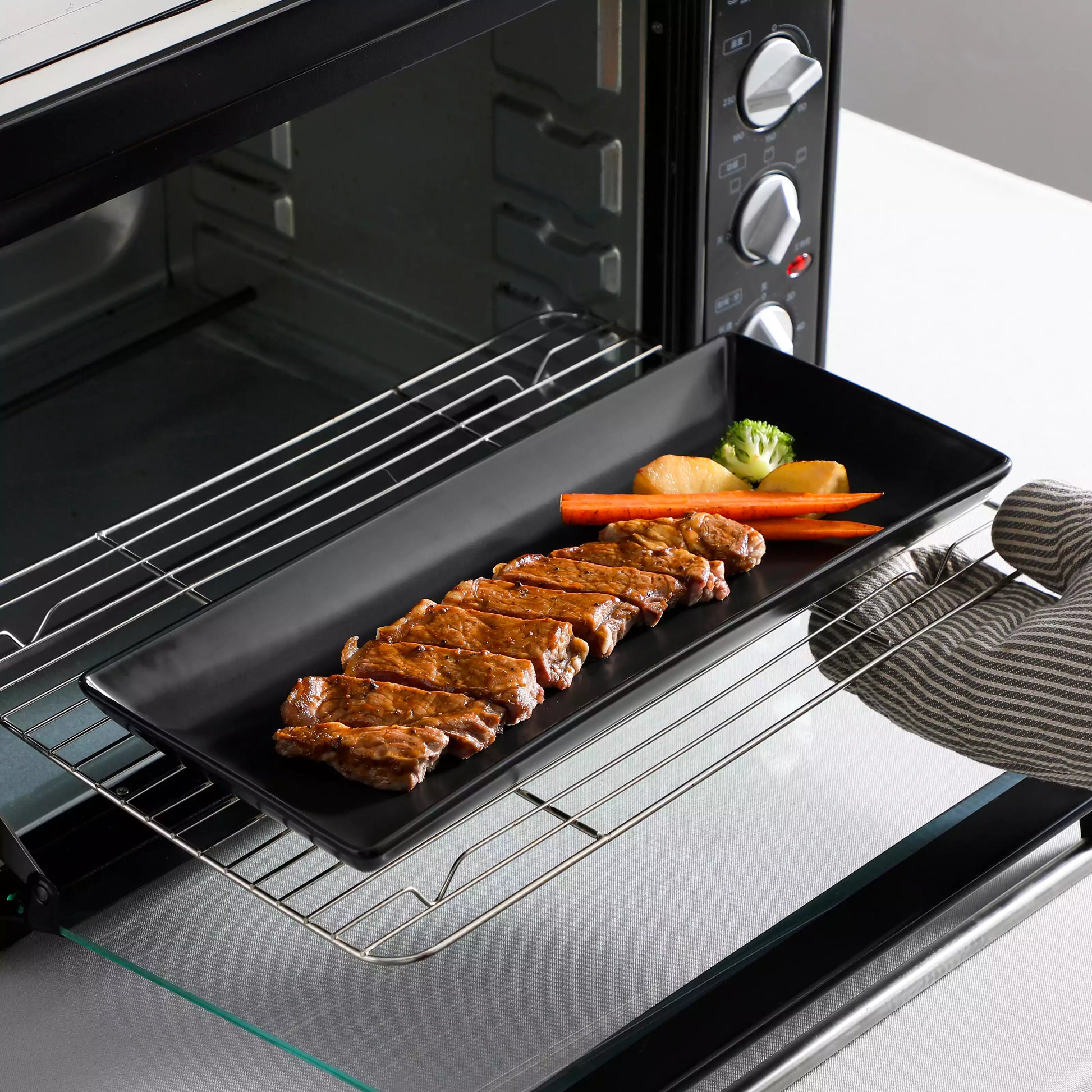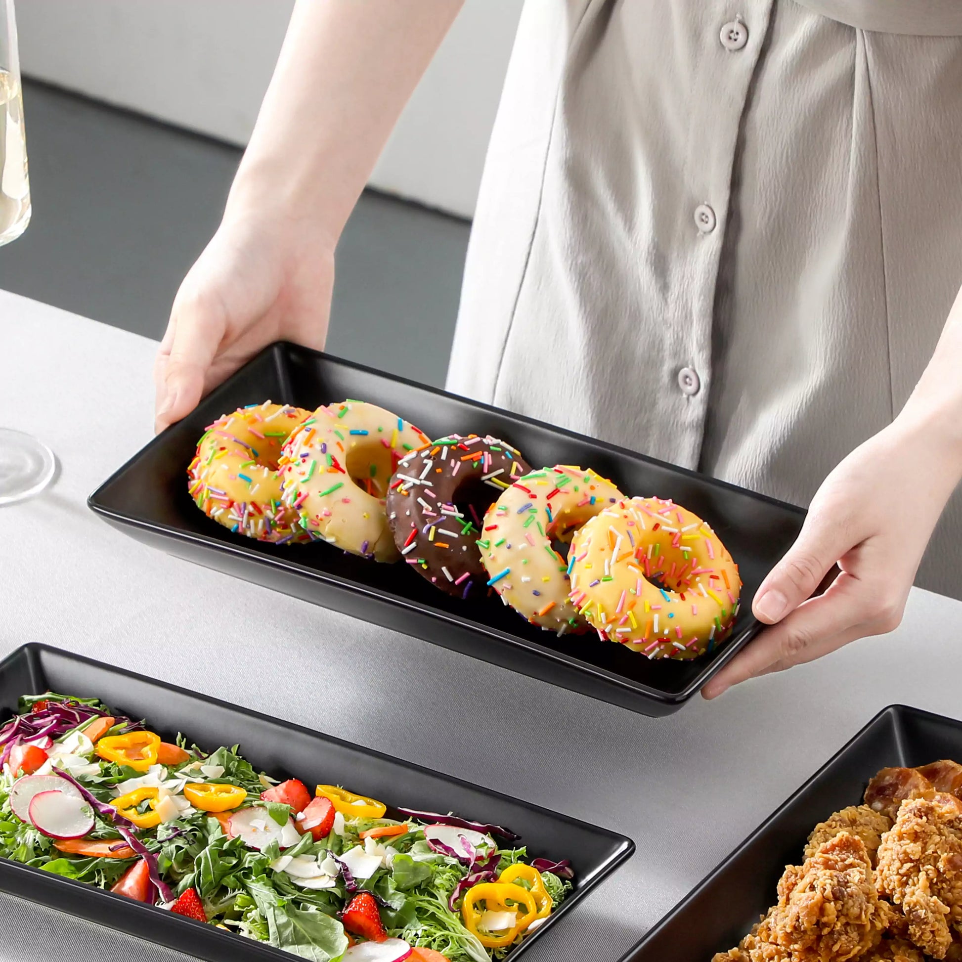Minimalist design meets everyday function in this matte black 3-tier server. The sturdy cast iron stand holds three rectangular stoneware plates with softly tilted rims to keep food neatly in place. The iron frame and corner supports come in black or gold, letting you choose your preferred style. Available in 12-inch and 14-inch sizes, it is perfect for serving appetizers, fresh fruit, pastries, and more, adding a contemporary touch to buffet tables, kitchen counters, or afternoon tea settings. The plates are microwave, oven, and dishwasher safe, while the frame should be wiped clean. Beyond the dining table, this versatile piece also doubles as a stylish organizer for jewelry or office essentials.