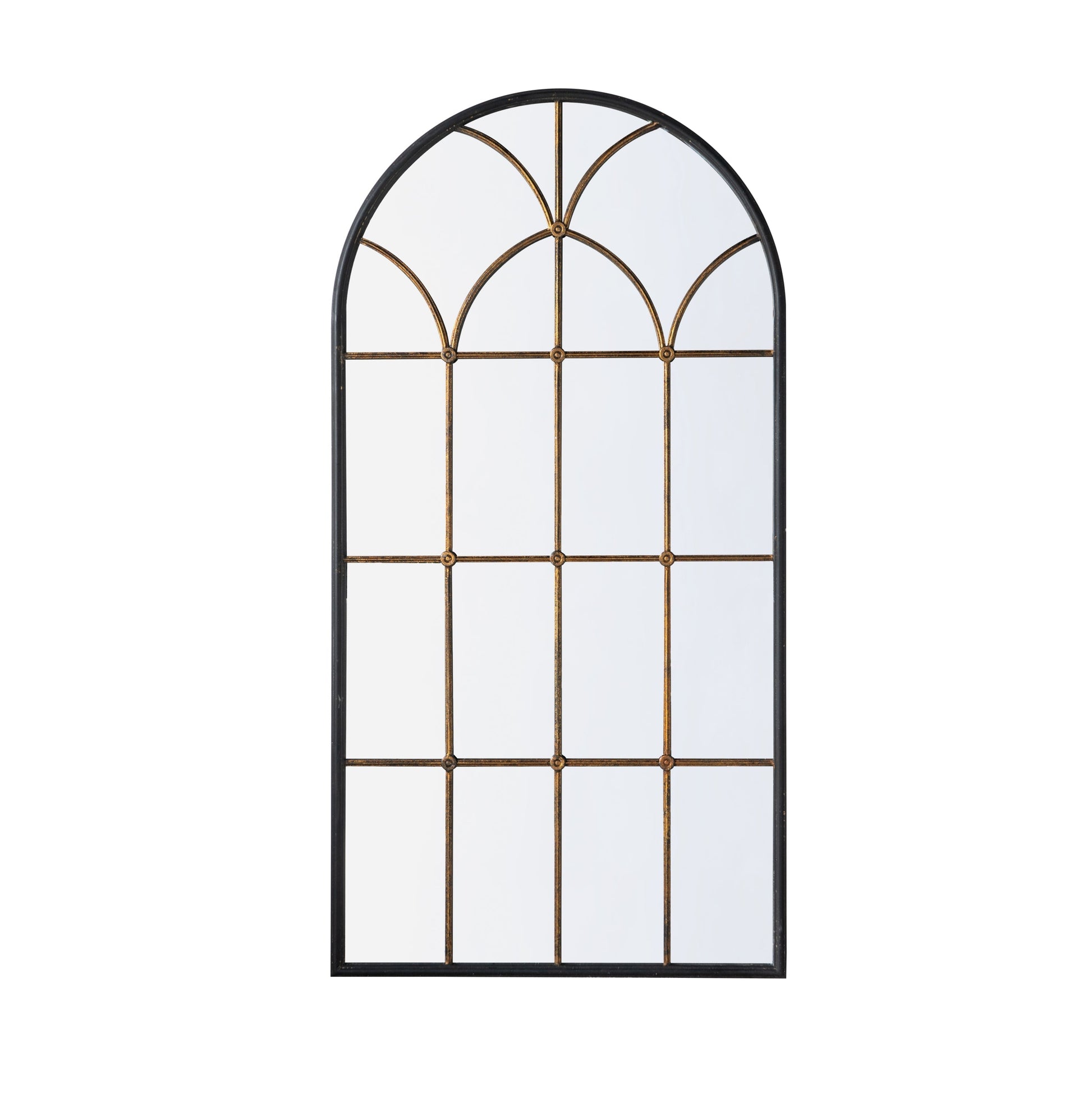 34x65.5' Arched Full-Length Mirror with Black and Gold Windowpane Design