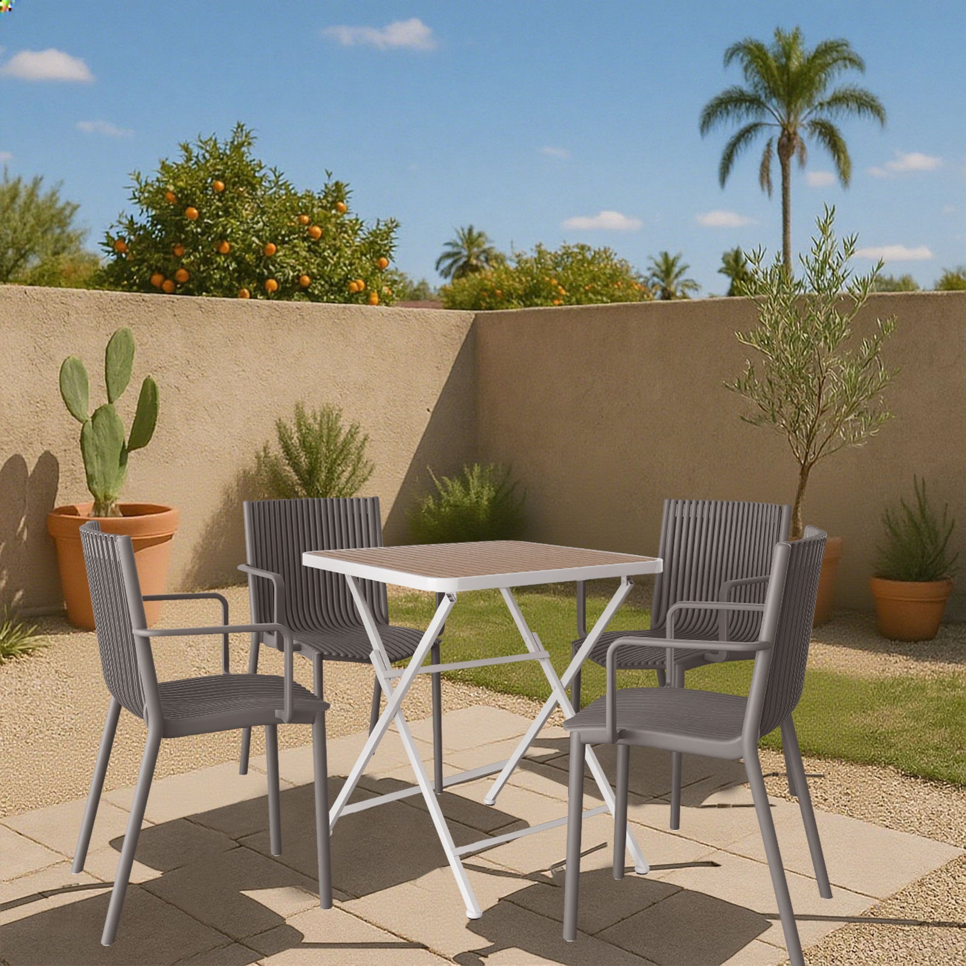 - All-Weather Durability: Chair & tabletop: high-quality polypropylene (waterproof, UV-resistant for over 17,520hrs outdoor use, mildew-resistant). Powder-coated metal legs: resist wind, rain, humidity.
