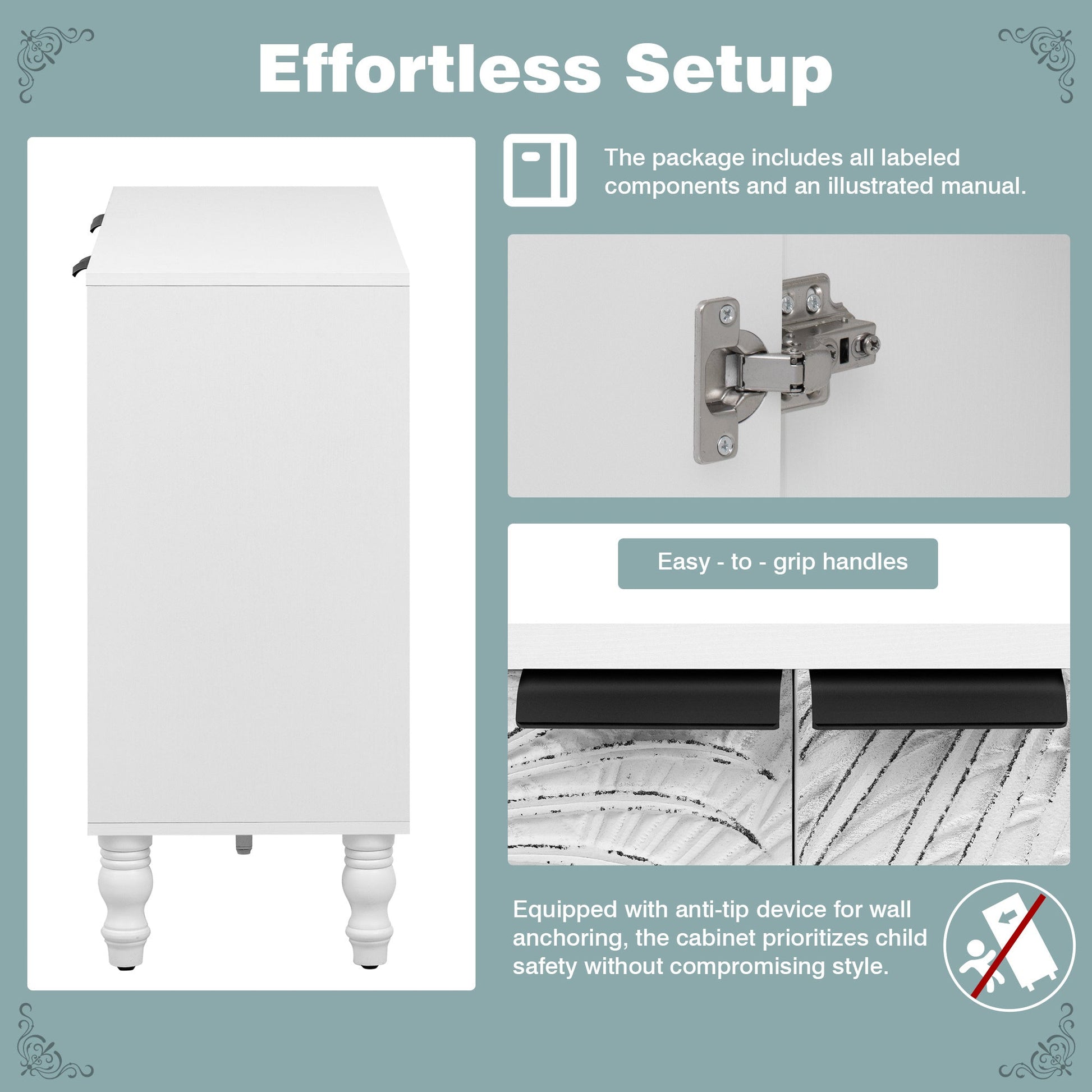 - Features 2 spacious cabinets and 2 adjustable shelves with three height options for customizable storage