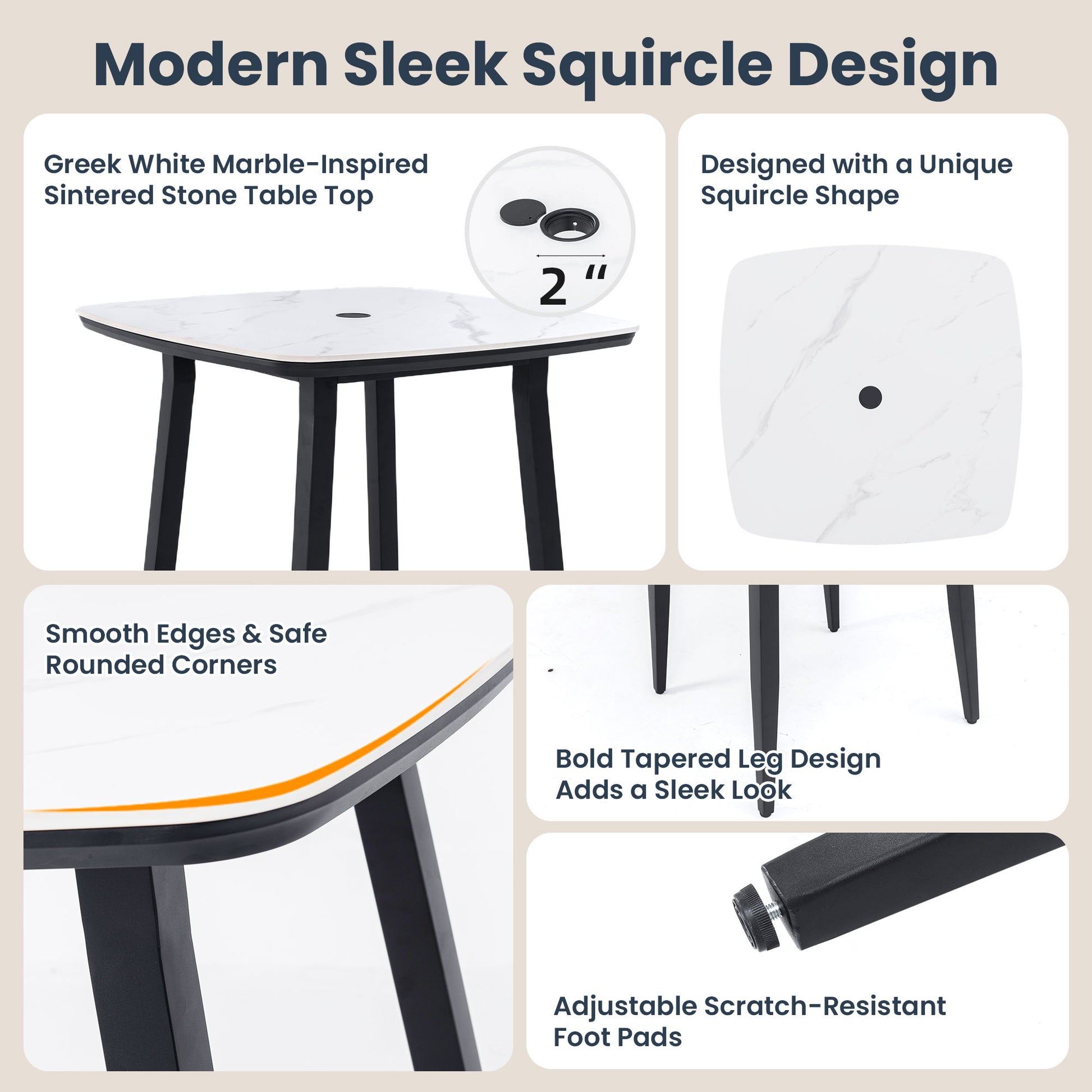 - Greek White Marble-Inspired Tabletop: Unique squircle tabletop with natural veining and an umbrella hole for added convenience.