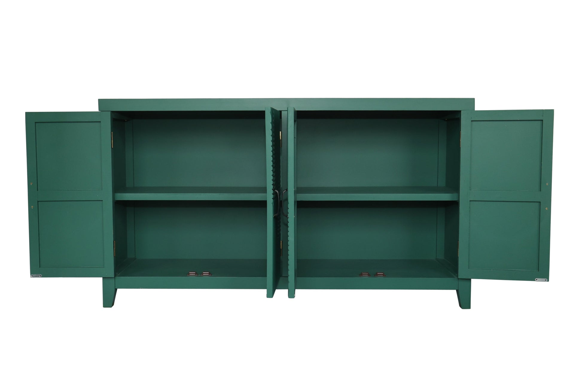 This 59-inch green accent cabinet with four doors fits perfectly in dining rooms, living rooms, or entryways, blending vintage mid century modern style with functional storage.