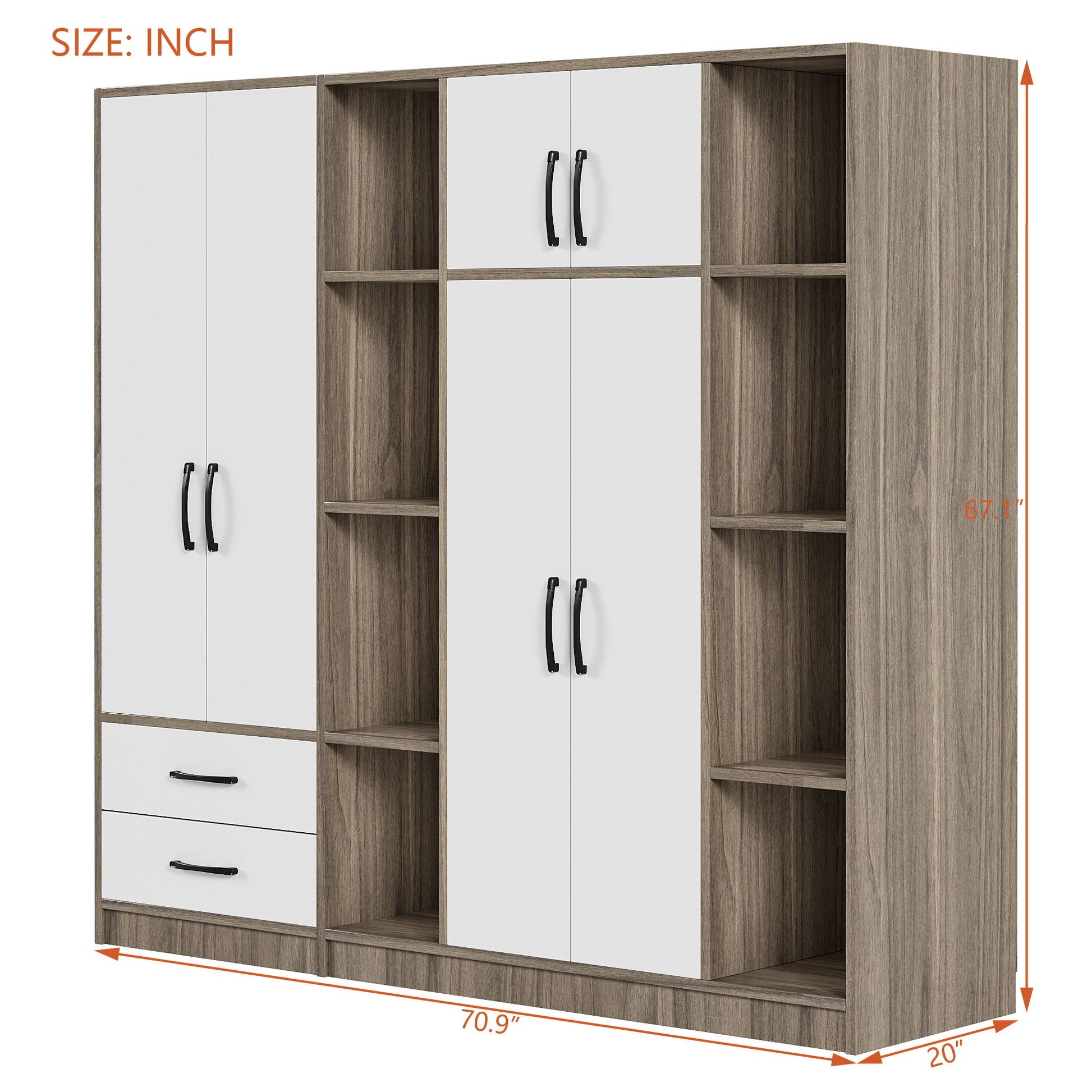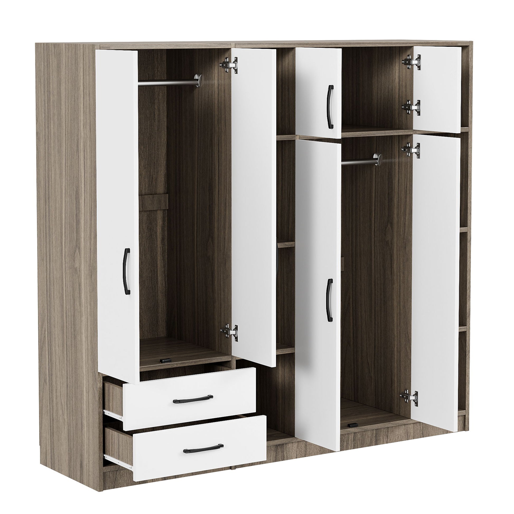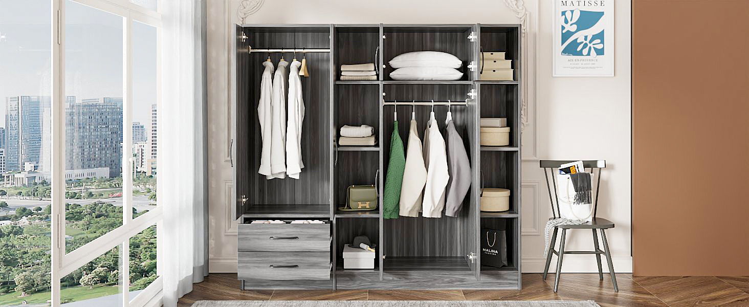 Maximized Storage: 6-Door Design Offers versatile storage options, including two dust-proof sections with hanging rods, pull-out drawers, a closed cabinet, and eight open shelves, providing ample room for a variety of items, from clothing to personal belongings.