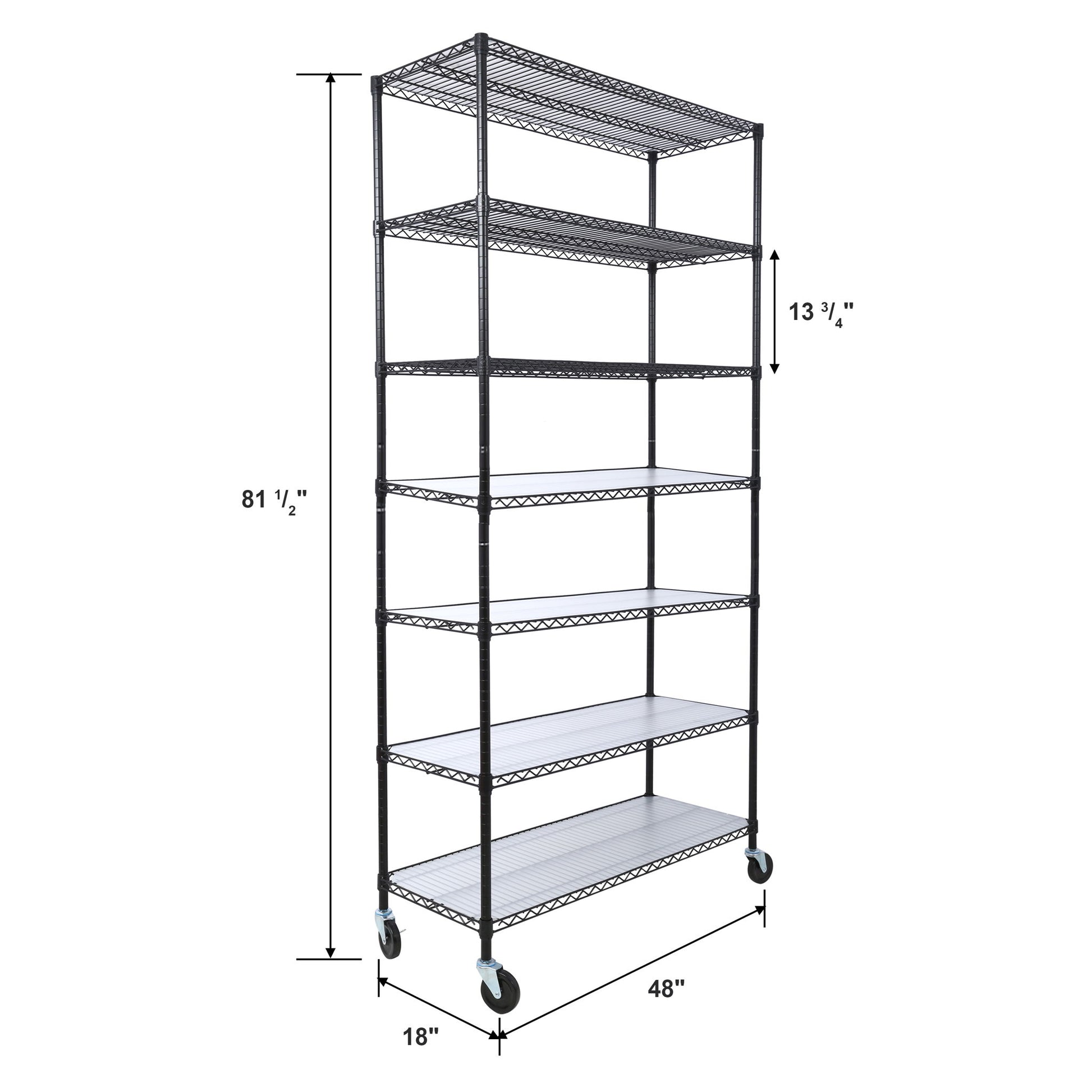 7 Tier Metal Shelf Wire Shelving Unit, 2450Lbs Heavy Duty Adjustable Storage Rack With Wheels & Shelf Liners For Closet Kitchen Garage Basement Commercial Shelving - Black