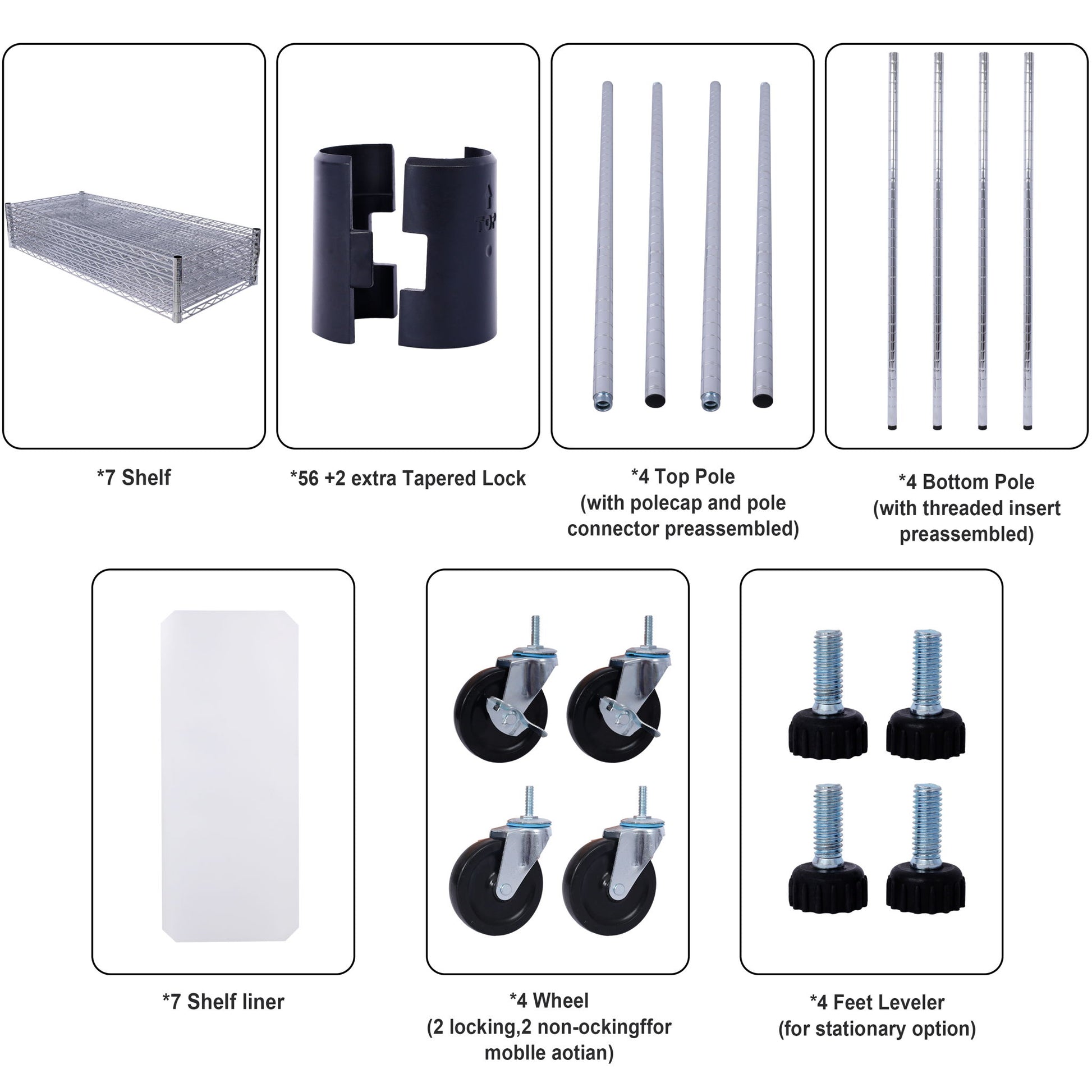 7 Tier Metal Shelf Wire Shelving Unit, 2450Lbs Heavy Duty Adjustable Storage Rack With Wheels & Shelf Liners For Closet Kitchen Garage Basement Commercial Shelving