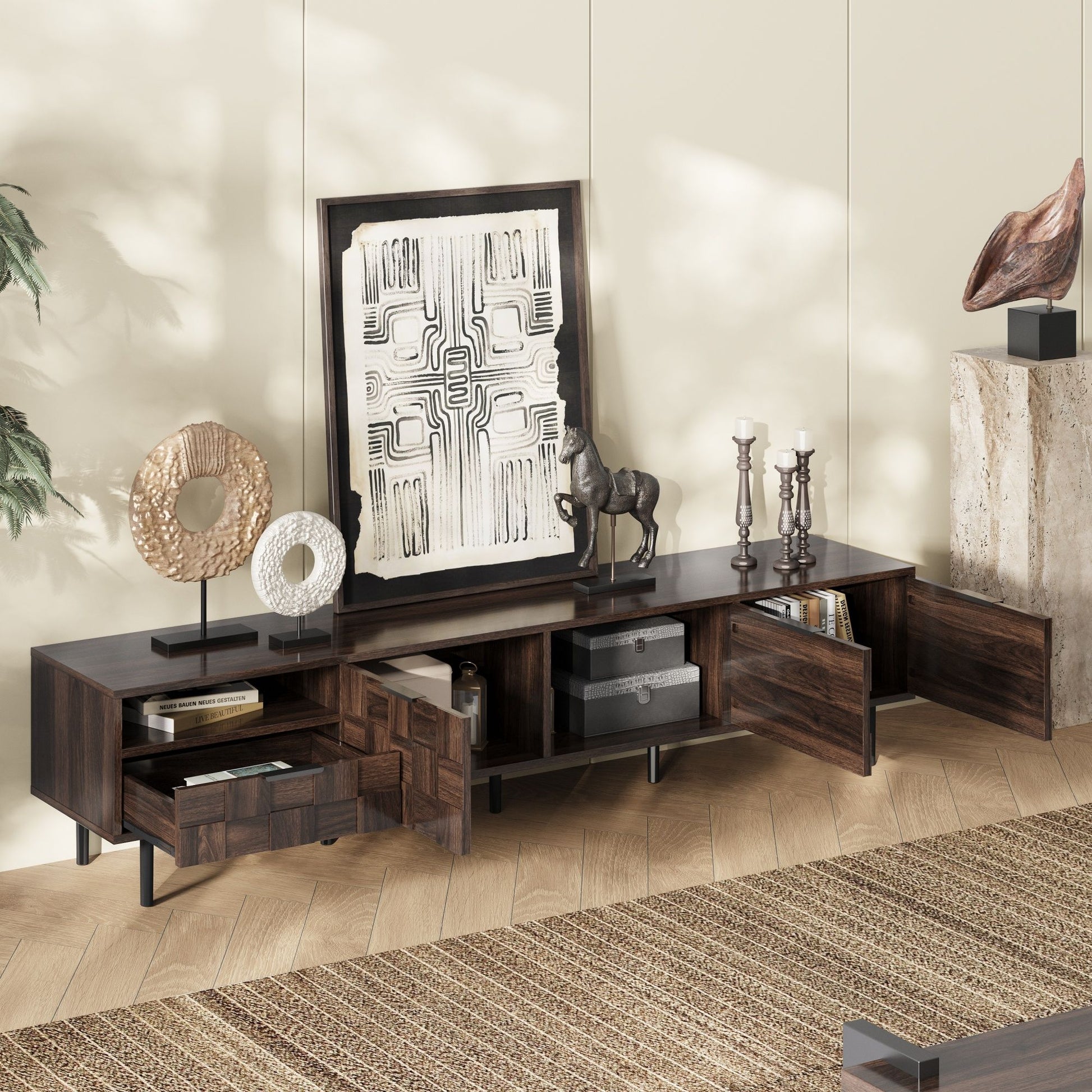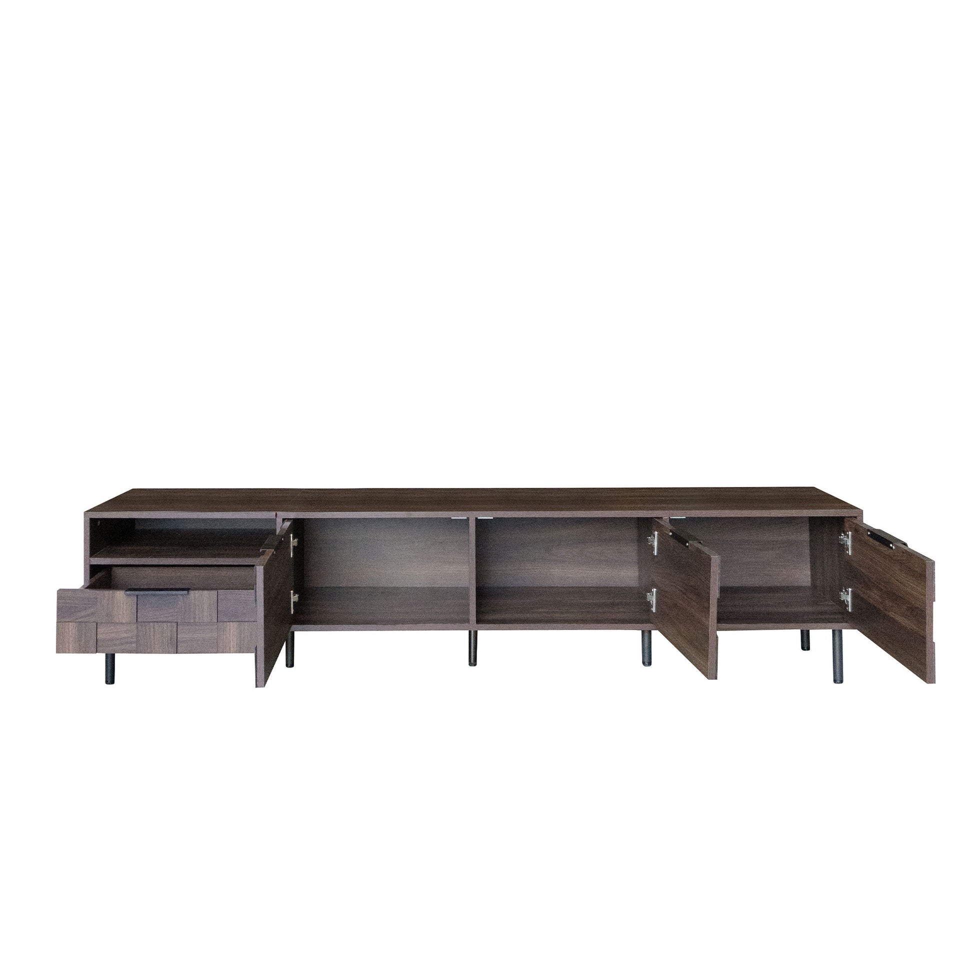- Ample and Organized Storage: Three soft-closing cabinets, one deep drawer, and an open shelf offer flexible space for media essentials.