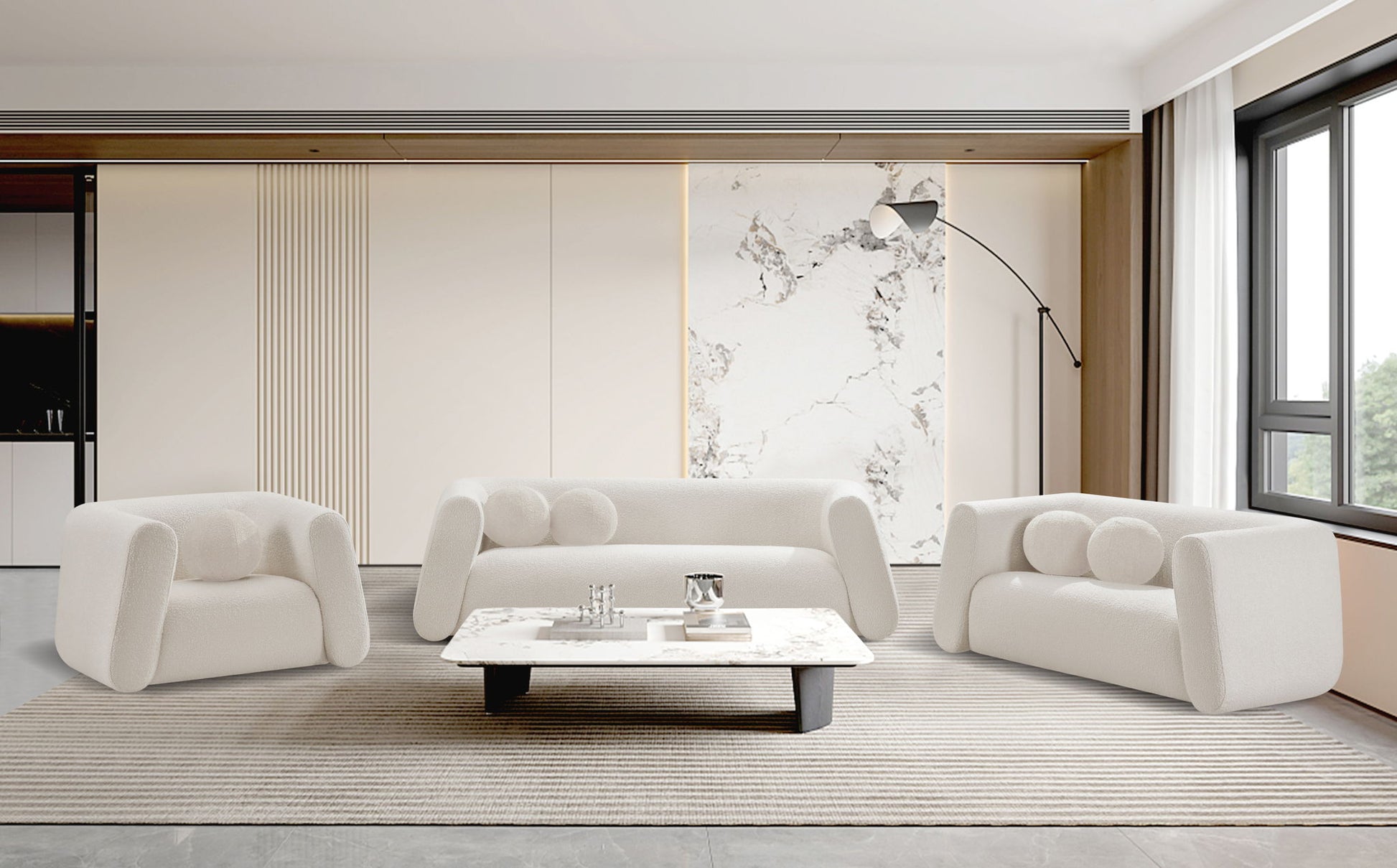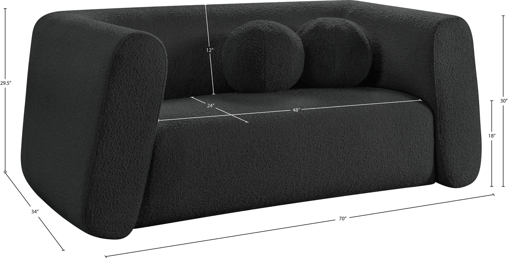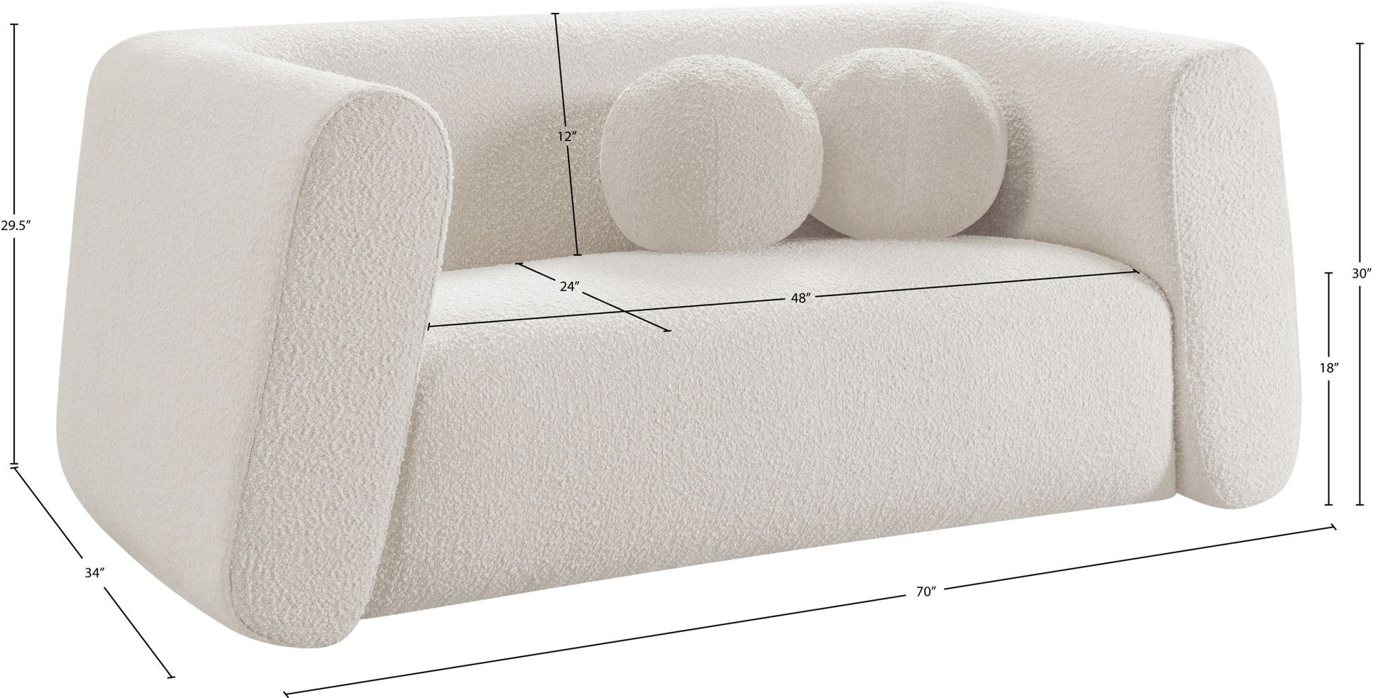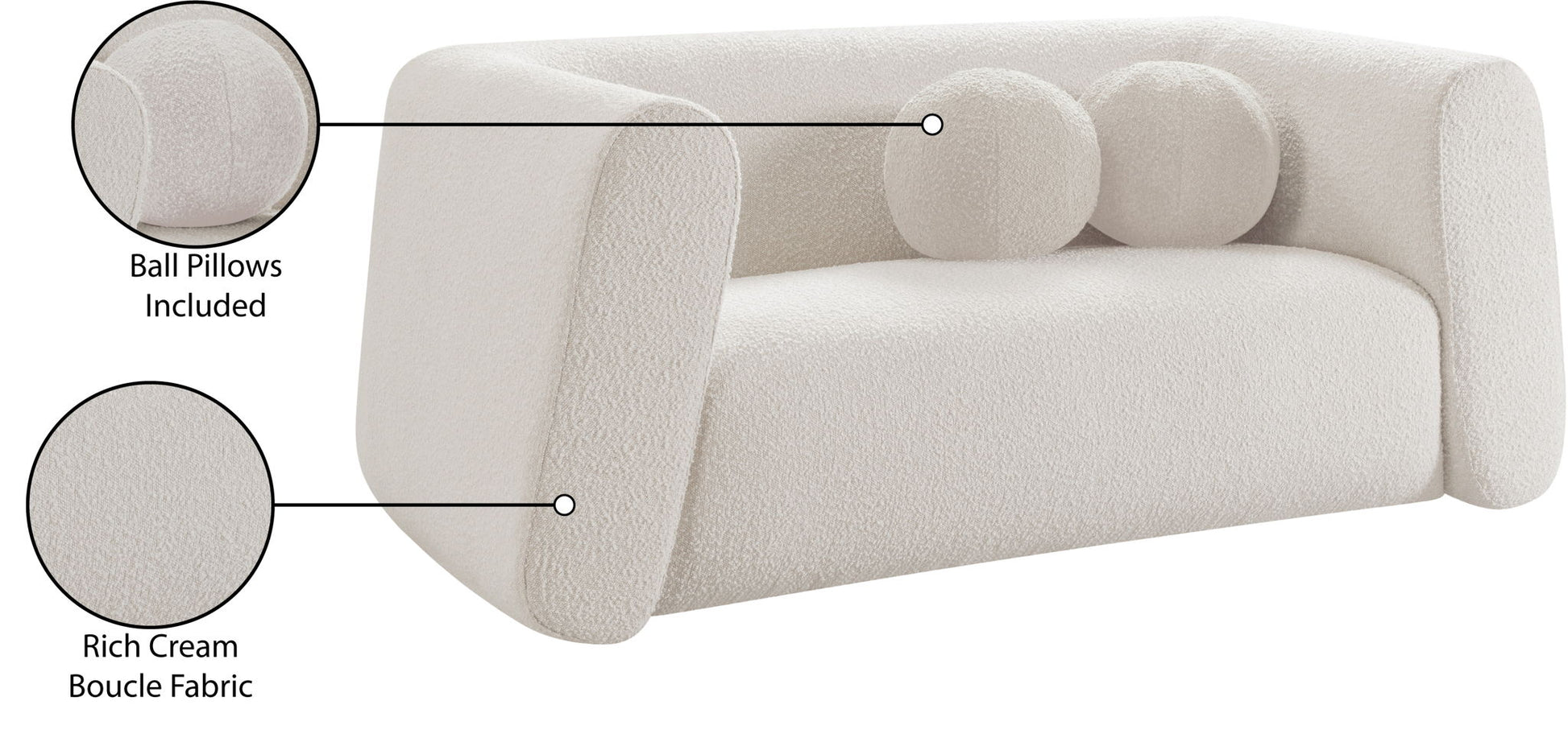 Give your room a new look with the chic Abbington loveseat in stunning boucle fabric. Embrace the richness of its texture and the boxy, geometrically inspired design that adds a touch of contemporary flair. This loveseat is not just furniture; it's an aesthetic experience. Complete with an included ball pillow, the Abbington loveseat is a sophisticated choice, promising both comfort and style for your living space. Redefine elegance with this eye-catching addition to your home from an unparalleled collection that lets you mix and match to suit your style preferences.