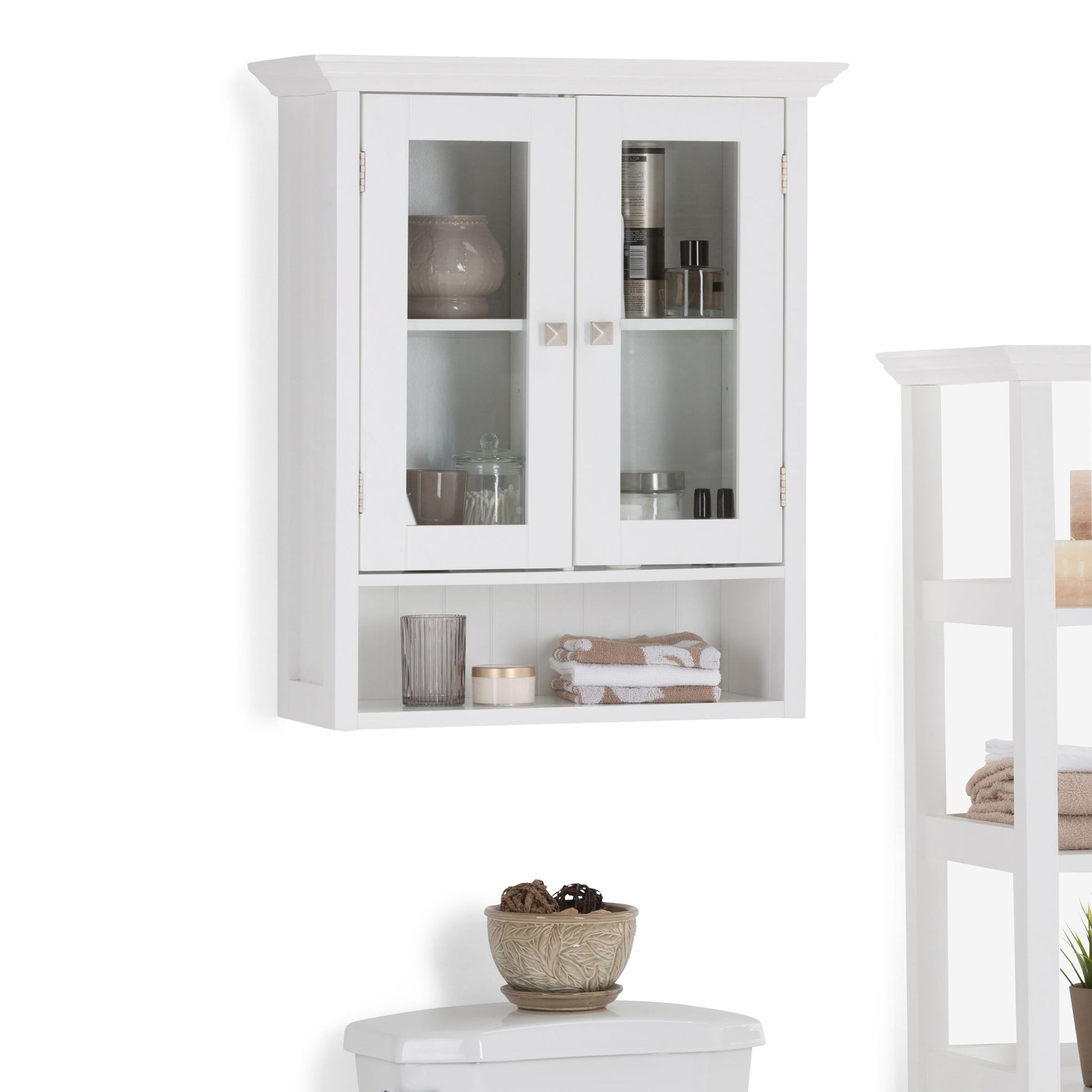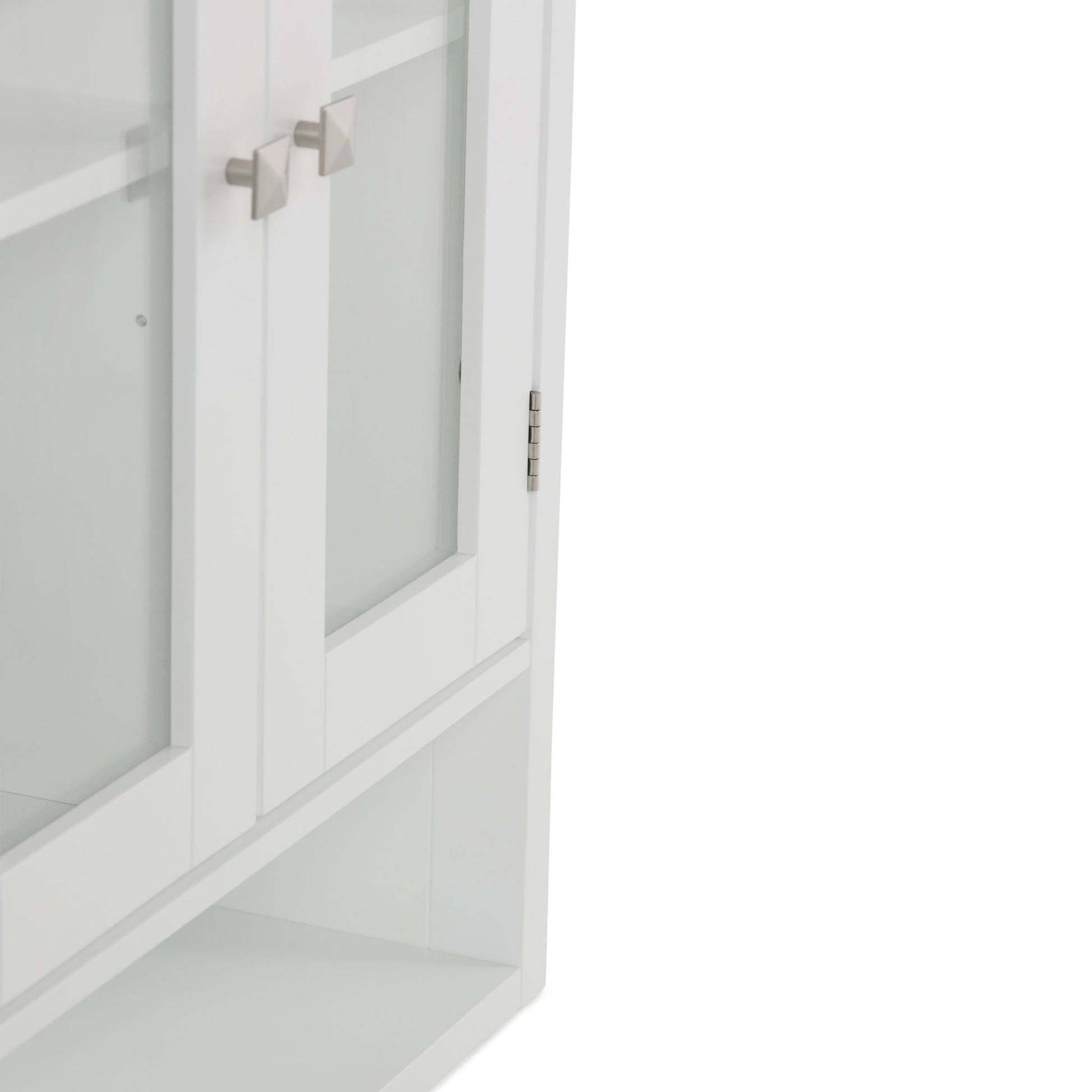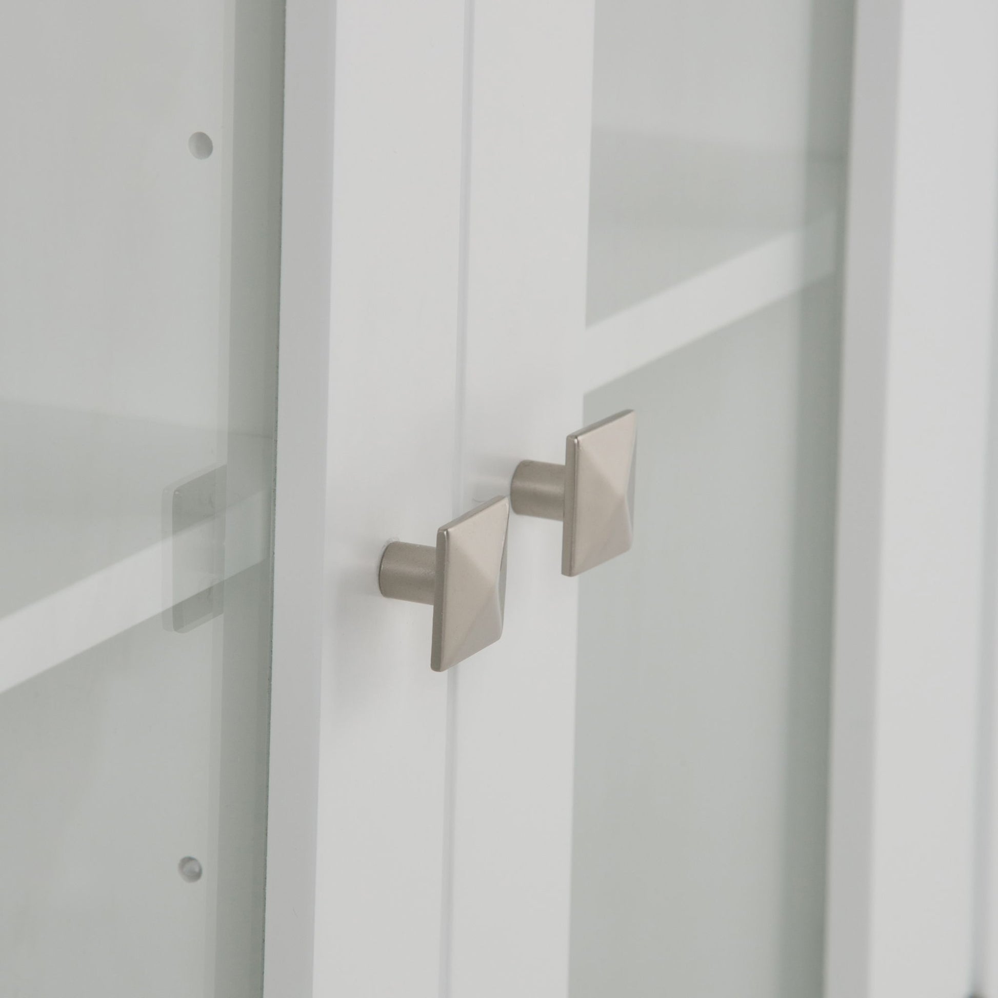 - Features two (2) doors with two (2) adjustable interior shelves and one (1) open bottom shelf. Brushed nickel hardware