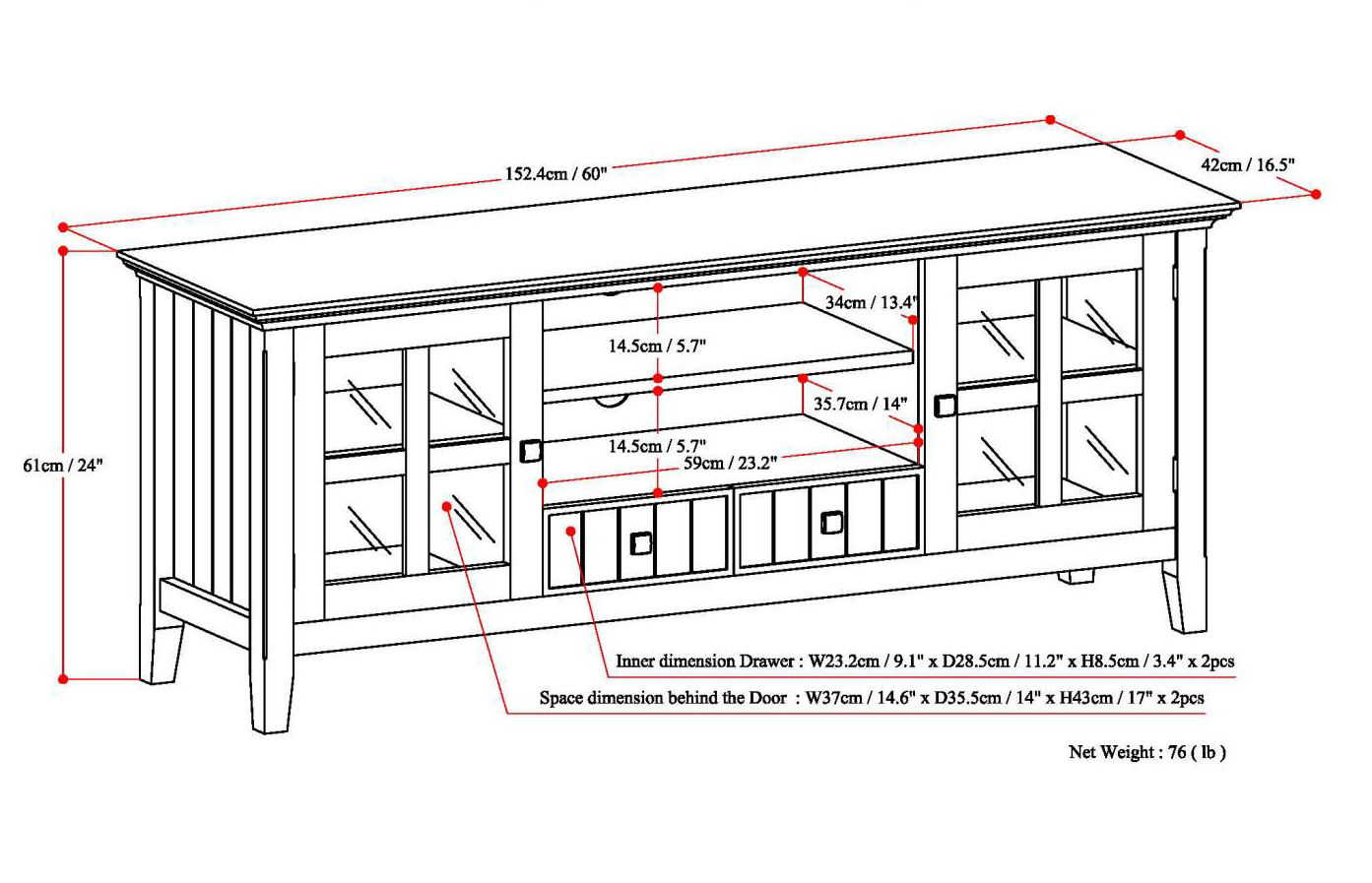 - Dimensions: 16.5" d x 60" w x 24" h