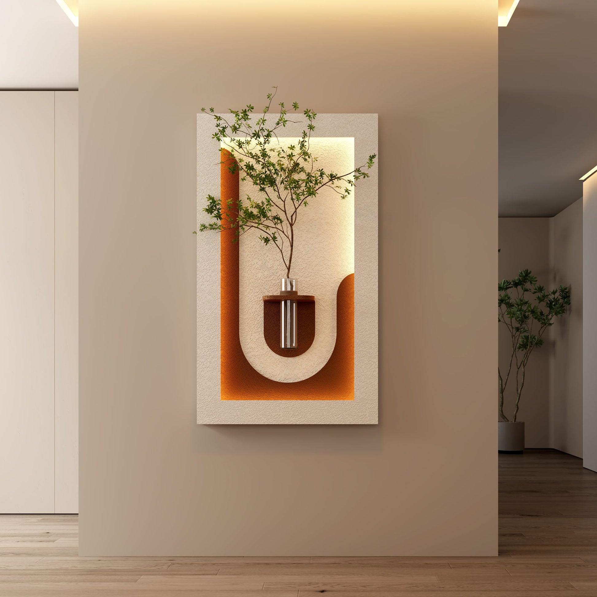 - Elegant 3D Design: Features a lifelike glass vase and simulated green plants with depth-enhancing textures for a natural indoor feel