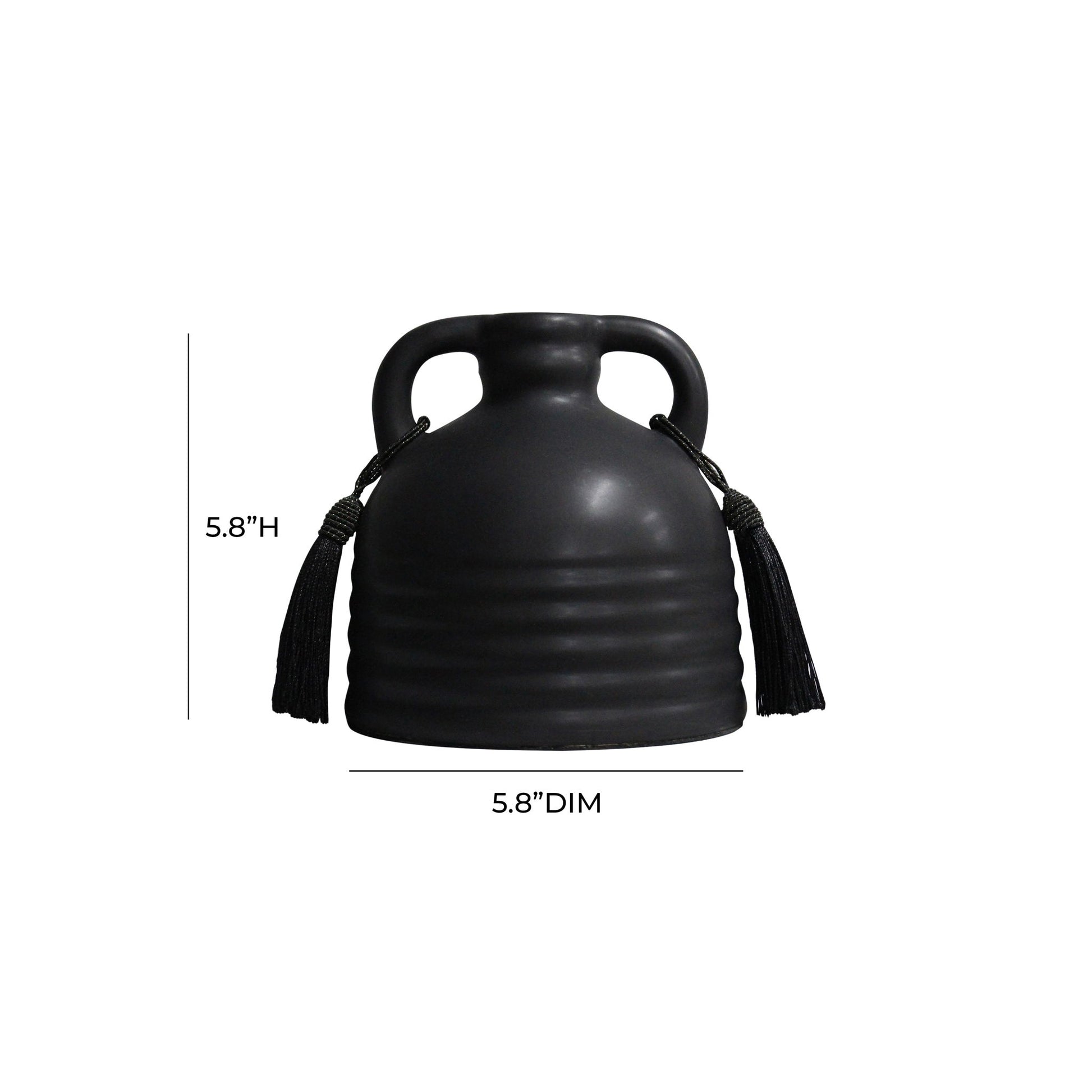 Adding a touch of whimsy and charm, the Adonis Ceramic Vase is perfect for your mantel, side table, or dining table! This beautiful, and carefully crafted vase stands at 5.8" tall with charming tassels on each handle. Its timeless design ensures this vase will remain a cherished piece for years to come.