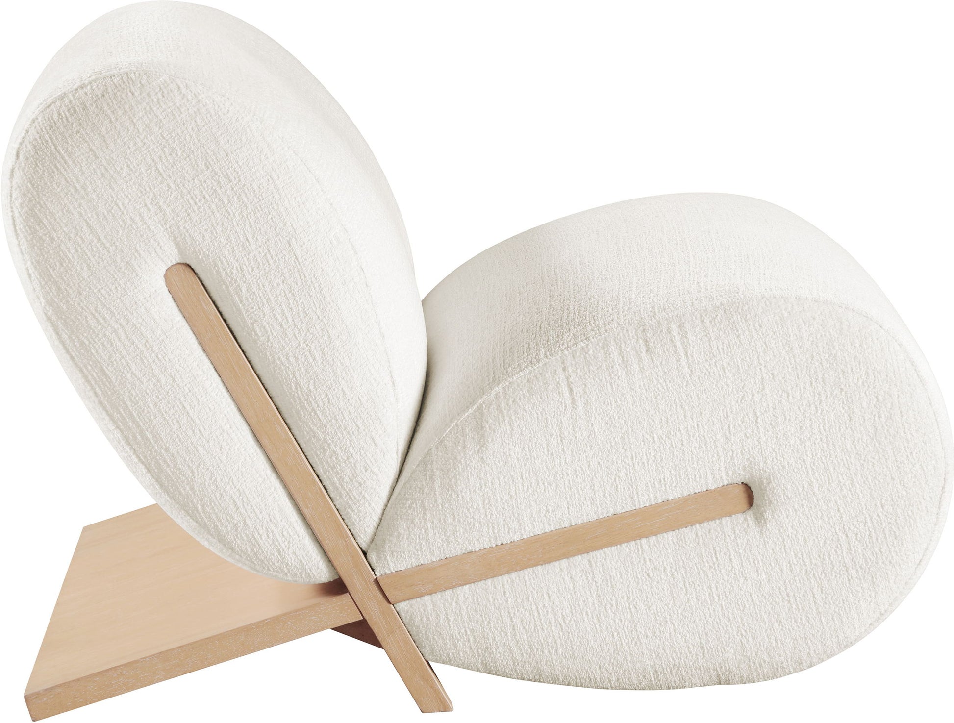 The Akira fabric upholstered accent chair features soft polyester fabric and a natural finish solid wood frame, blending comfort with striking design. Its bold, Art Deco-inspired silhouette showcases a sculptural form, making it a standout piece in any modern space. With plush upholstery and a uniquely structured wooden base, this chair offers both visual intrigue and cozy relaxation-perfect for those who appreciate artistic yet functional furniture.