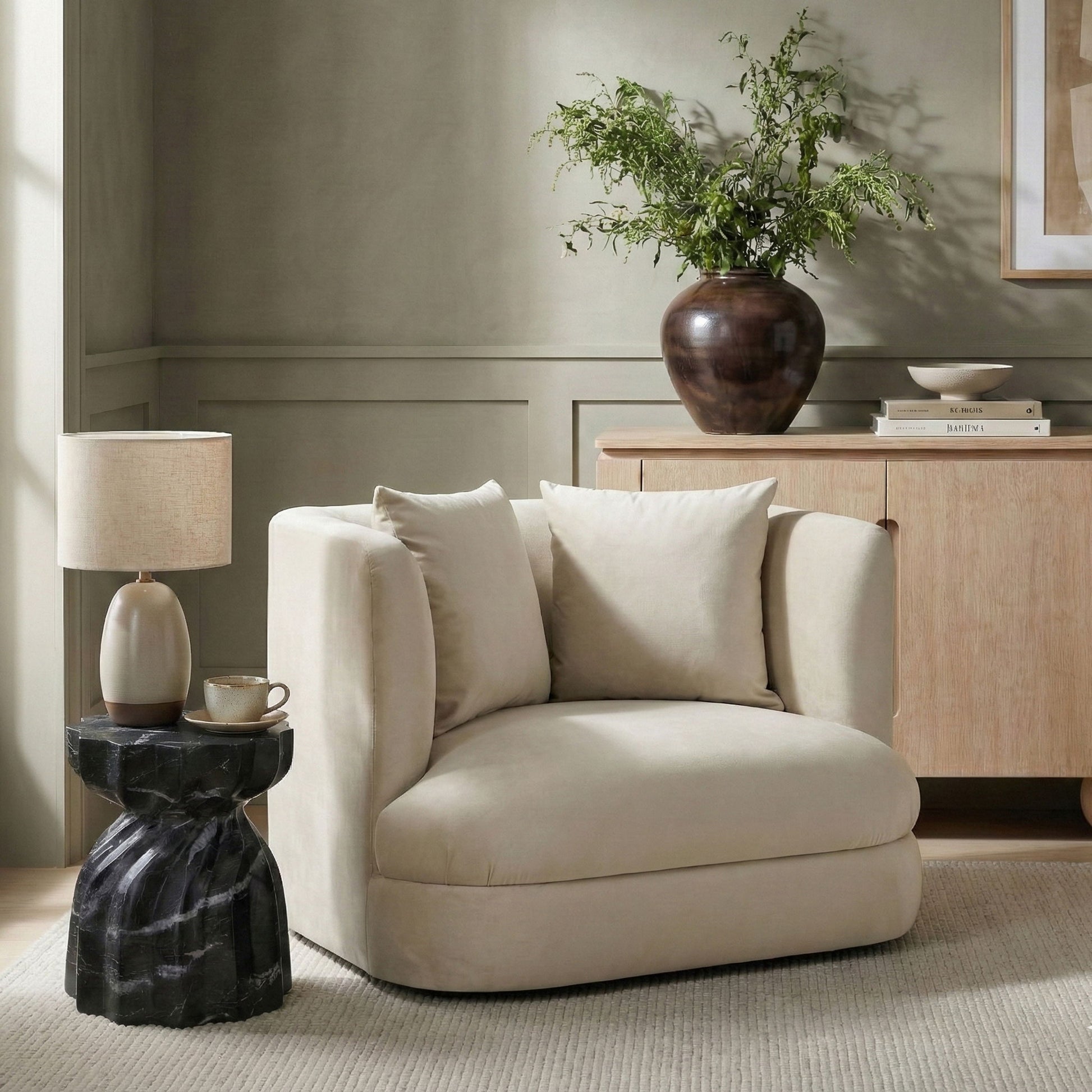 The Alder velvet upholstered accent chair is an invitation to relax. Its rounded silhouette and soft velvet upholstery create a cozy and inviting space, perfect for curling up with a good book or simply unwinding after a long day. Whether you're entertaining guests or enjoying a quiet moment alone, it is the ideal place to unwind.