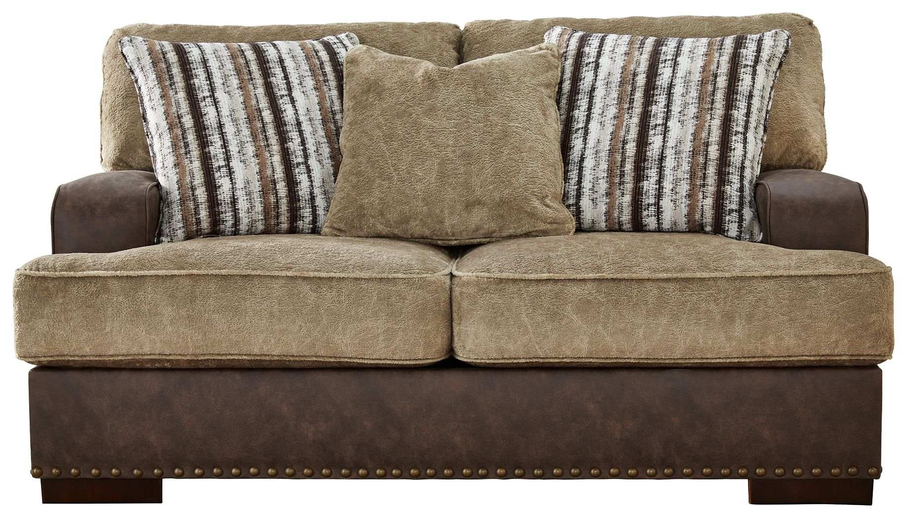 Punctuated by a subtle band of nailhead trim, this loveseat is perfect for those who love the look of leather. Two textural tones provide twice the style and comfort—and incorporate an added layer of visual interest. Throw pillows add a fun decorative element.