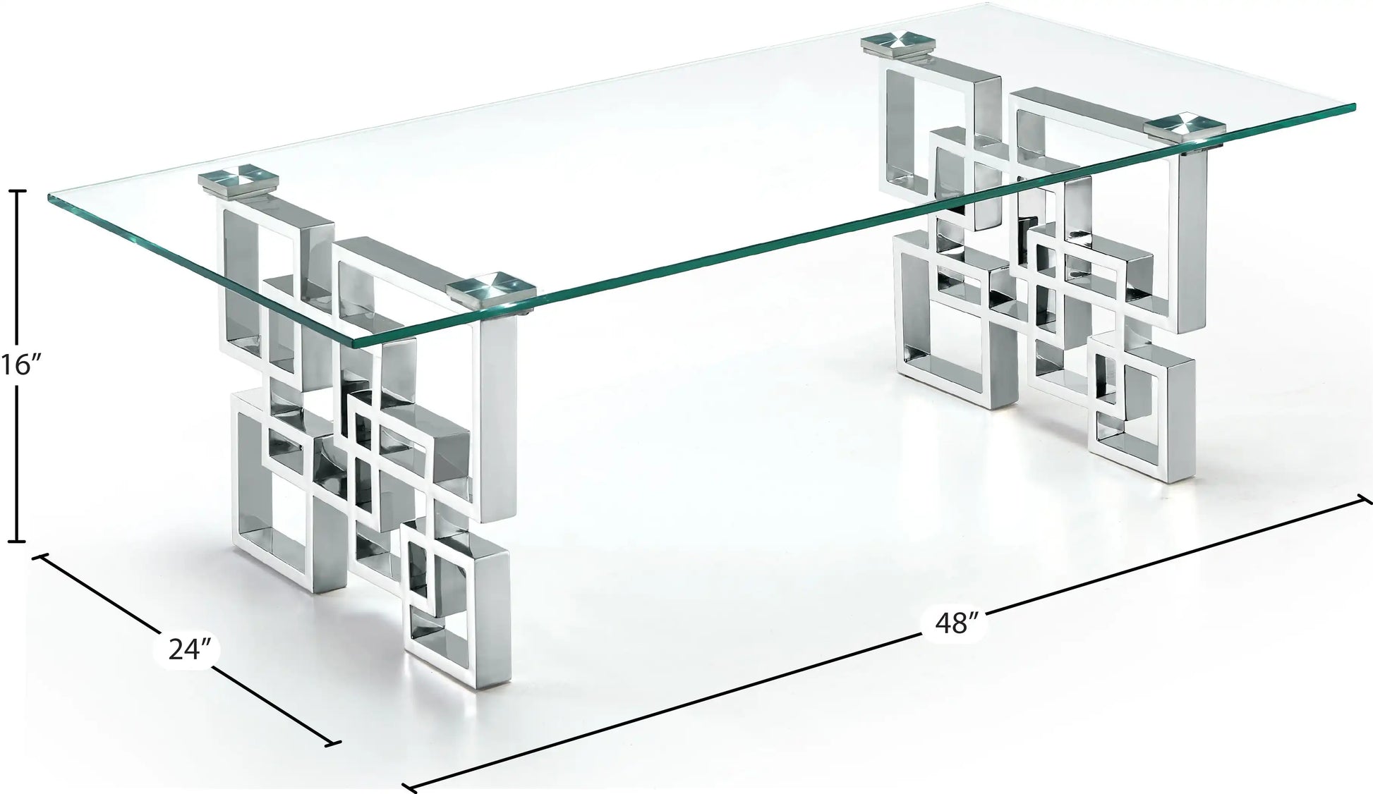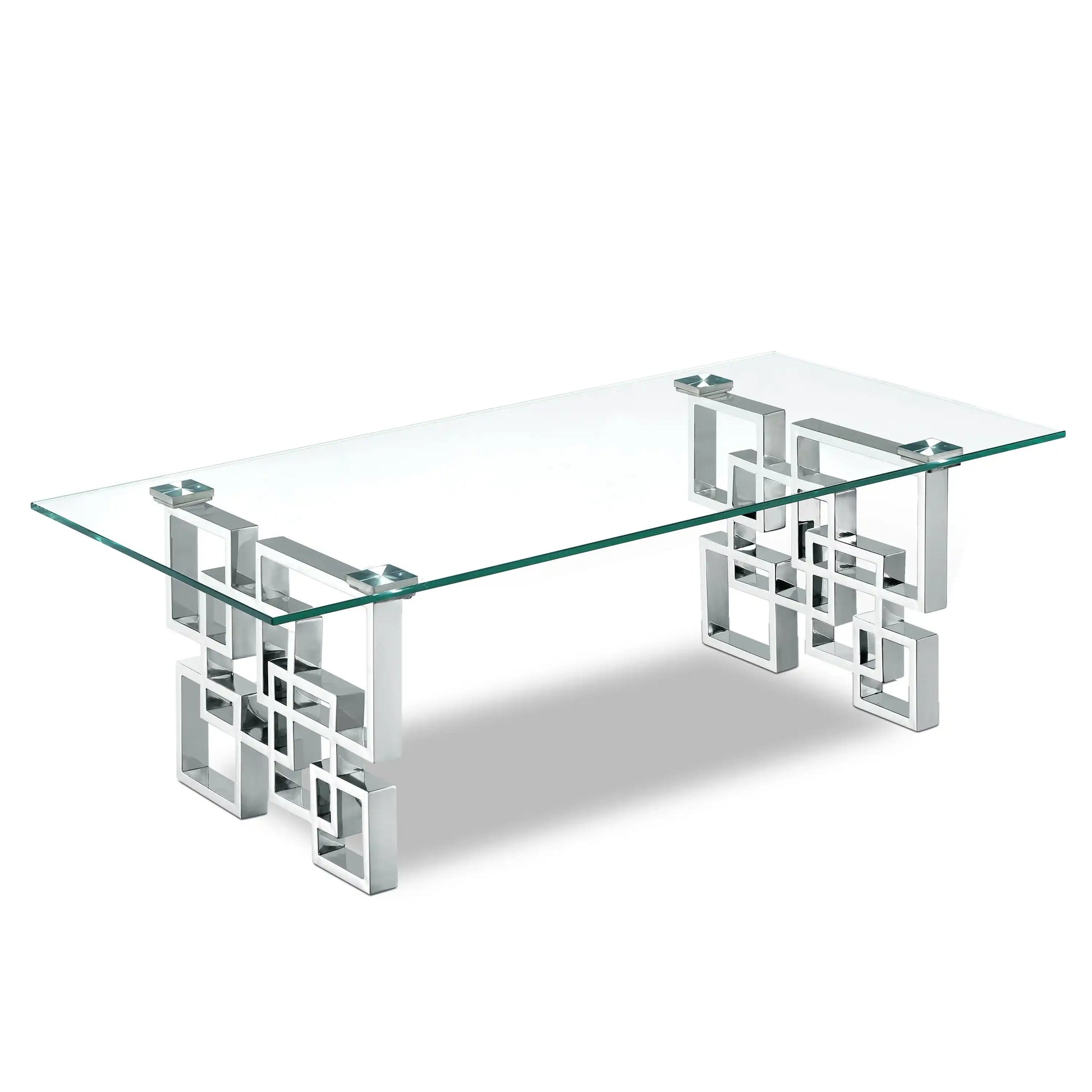 Enjoy a contemporary look in your living room or den with this stylishly elegant Alexis chrome coffee table. This Meridian Furniture table is made from glass and metal for a sleek, modish look. The base features a geometric design with intertwined squares that form two pedestals. The top is crafted from thick, clear glass that allows the beauty of the base to shine through completely. A chromed finish shores up the design, adding to its up-to-the-minute feel.