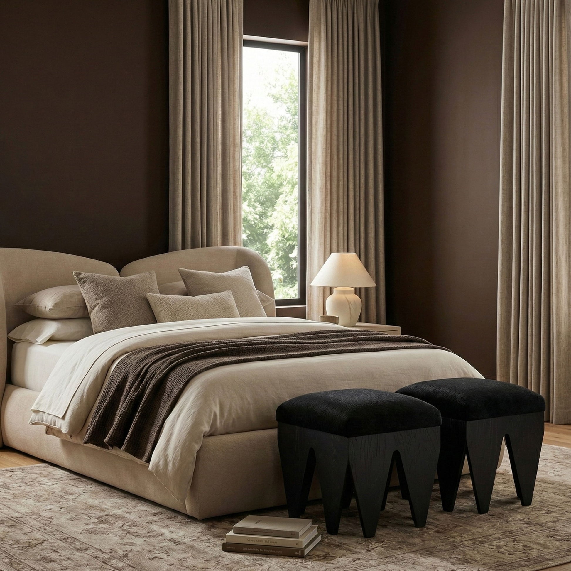 Bold and architectural, the Altair velour fur fabric upholstered bench combines avant-garde design with plush luxury. The seat is covered in soft velour fur fabric, offering an indulgent texture that invites you to sit and relax. Its distinctive rich black oak veneer wooden base, featuring sharp, angular legs, brings a sculptural, modern touch to any room.
