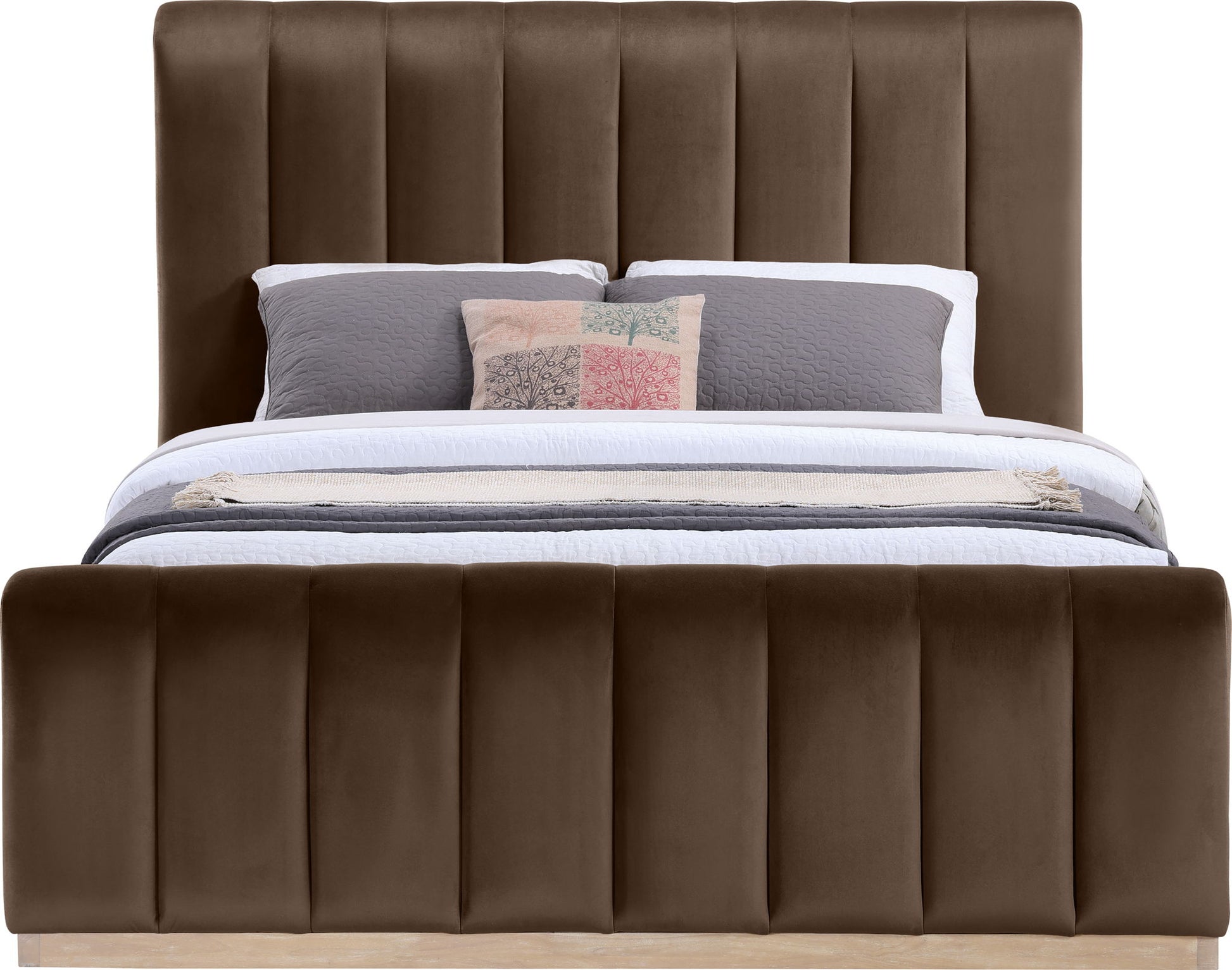 Draped in ultra-luxe 460 GSM velvet, the Amara velvet upholstered king bed exudes elegance and sophistication. Its solid wood inner frame provides lasting durability, complemented by a natural-finish solid wood base for a refined touch. Designed with a sleek contemporary aesthetic, this bed seamlessly blends style and comfort.