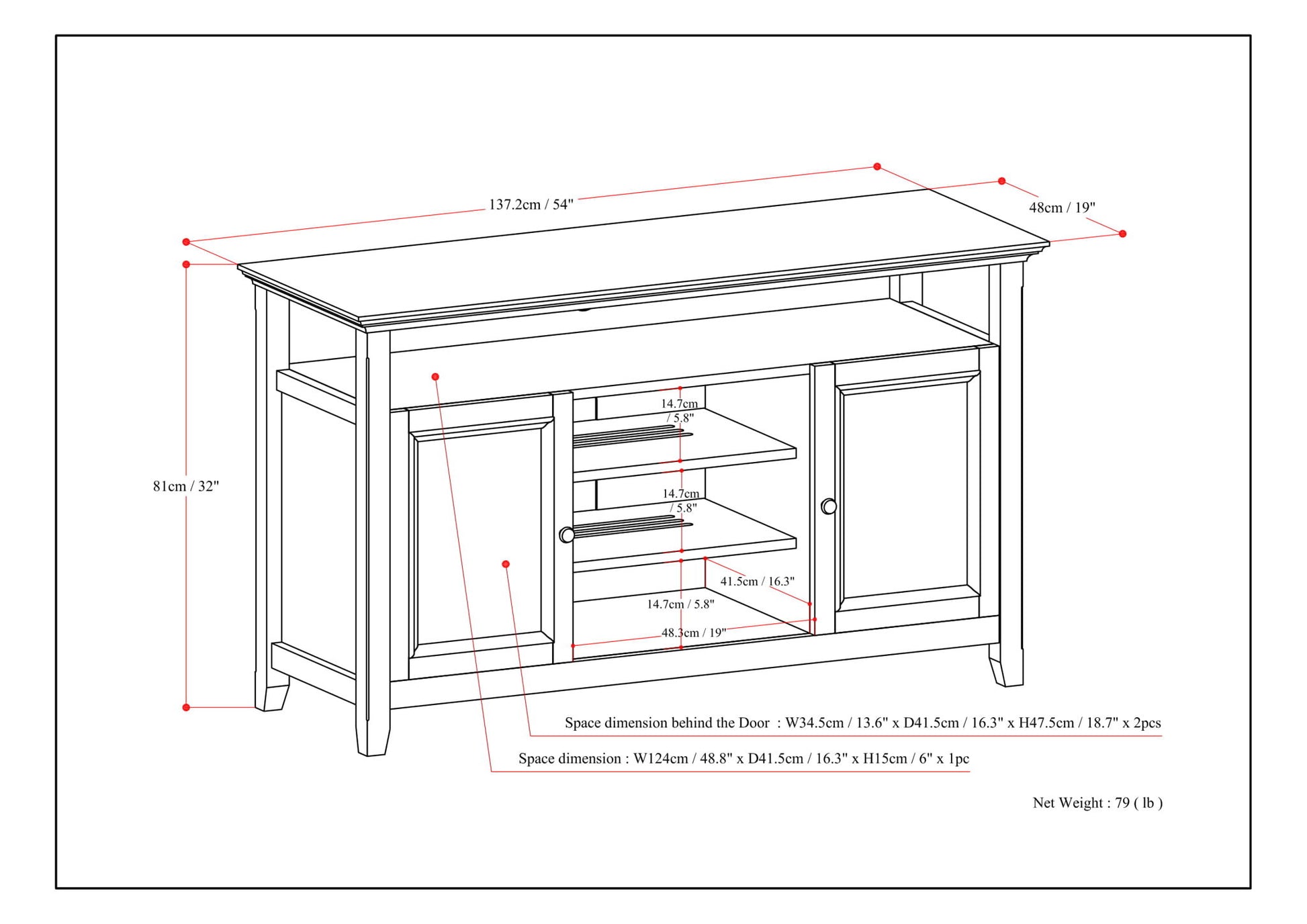 54.0"W x 18.9"D x 31.9"H - 78.9 lb