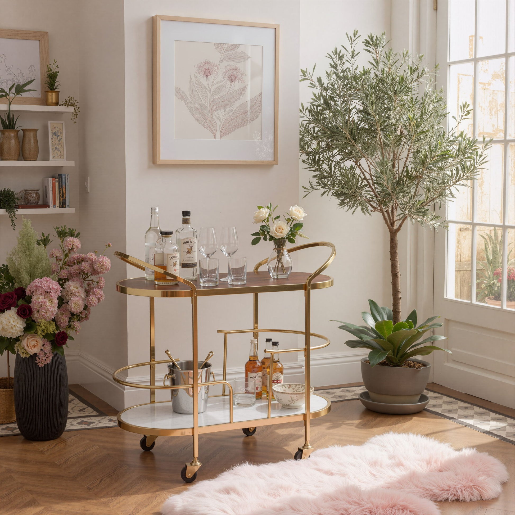 Introducing the Antalya Bar Cart, a stunning and modern piece of furniture that will add a touch of elegance and functionality to any living room or dining area. The bar cart features a deco-inspired design with a combination of brown lacquered acacia wood and brushed steel.