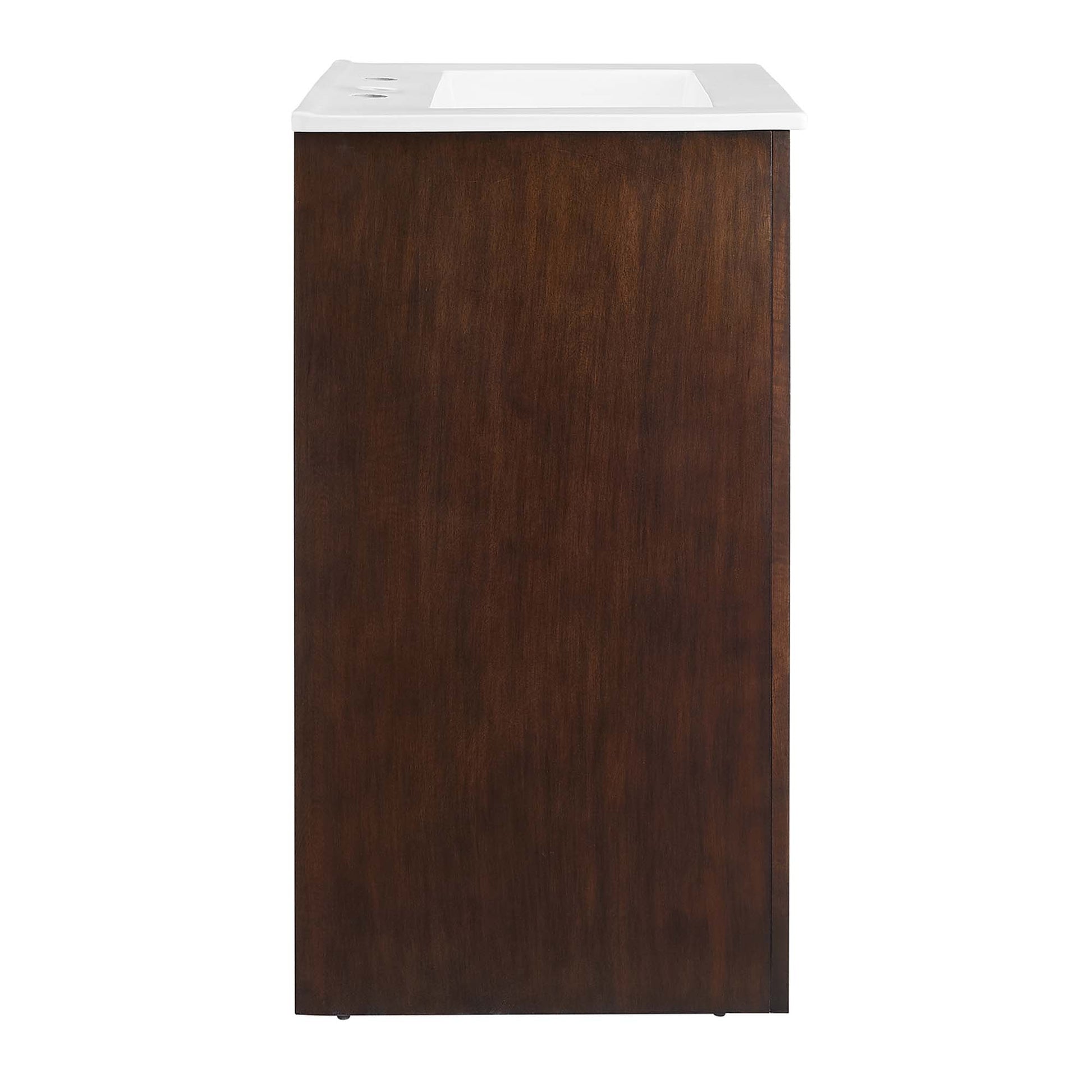 Elevate your bathroom's style with the Appia 24" Single Bathroom Vanity, where retro elegance meets functionality. Expertly crafted from high-quality MDF and adorned with a mango wood veneer, this vanity cabinet brings stunning organic aesthetics to your bathroom. Its unique arched door adds beautiful dimension to any primary or guest bathroom. Featuring soft-close hinges, the Appia compact vanity offers a smooth, quiet experience and includes an adjustable shelf with a convenient plumbing cut-out, providing ample storage for all your small space vanity bathroom essentials. With its white ceramic sink basin with 8" widespread holes and integrated countertop, this sink cabinet easily becomes a functional centerpiece in any bathroom. Assembly is straightforward, ensuring you can enjoy this stylish and modern vanity effortlessly. Includes adjustable non-marking foot pads to protect flooring. Fixtures not included.