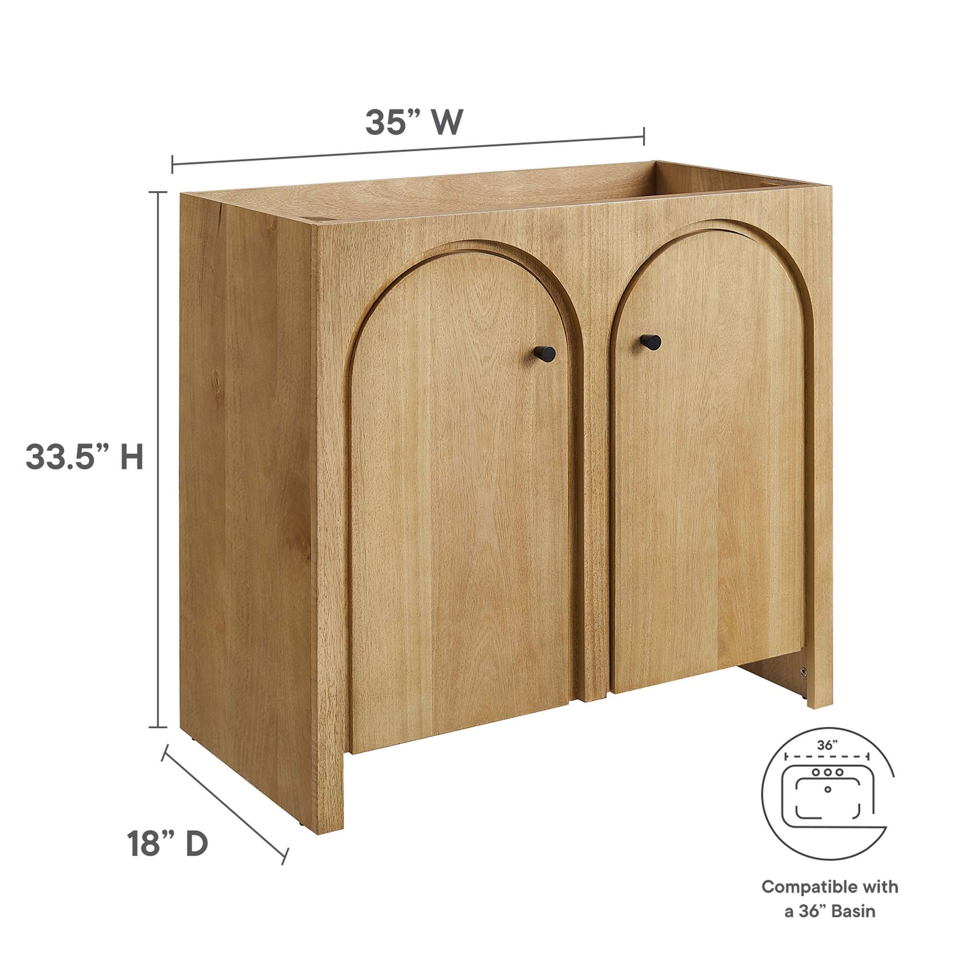Elevate your bathroom's style with the Appia 36" Bathroom Vanity Cabinet, where retro elegance meets functionality. Expertly crafted from high-quality MDF and adorned with a mango wood veneer, this vanity cabinet brings stunning organic aesthetics to your bathroom. Its two arched doors add beautiful dimension to any primary or guest bathroom. Featuring soft-close hinges, the Appia vanity offers a smooth, quiet experience and includes an adjustable shelf with a convenient plumbing cut-out, providing ample storage for all your bathroom essentials. Assembly is straightforward, ensuring you can enjoy this stylish and modern vanity effortlessly. Sink basin and fixtures are not included with this chic and practical bathroom vanity cabinet. Includes adjustable non-marking foot pads to protect flooring. Top Panel Weight Capacity: 250 lbs.