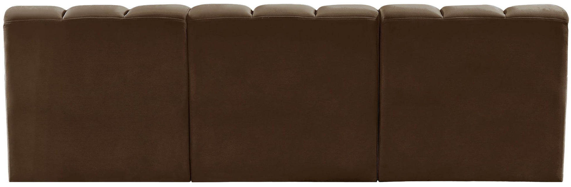 Designed to elevate contemporary interiors, the Arc modular sofa from Meridian Furniture brings sculptural presence and refined comfort to the living room or den. Upholstered in rich brown velvet, its curved silhouette and deep channel tufting create a tailored look that feels both inviting and visually striking. The plush fabric enhances the depth of color while adding a soft, luxurious hand.