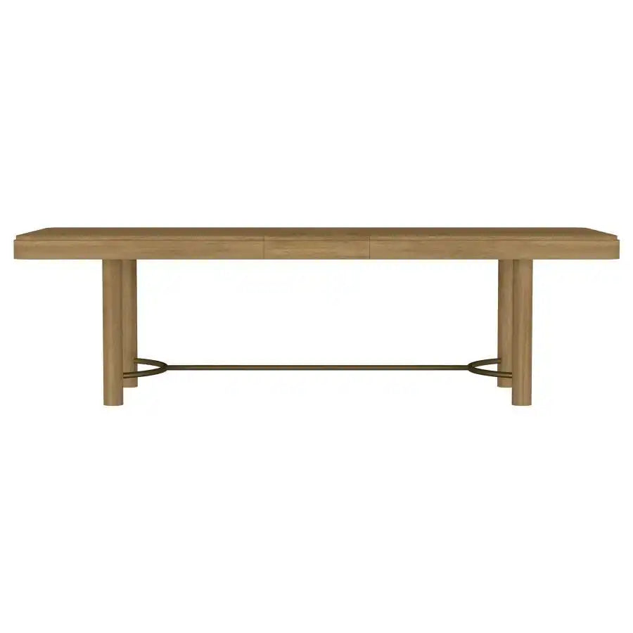 This dining set blends modern craftsmanship with natural textures for a refined yet inviting feel. The dining table features a trestle base with an antique brass-finished metal stretcher bar, adding stability and contrast. Rounded corners soften the rectangular top, while a removable 18-inch leaf allows for flexible seating. The dining chairs feature handwoven cane backrests, solid wood frames, and Pirelli webbed seat cushions upholstered in beige linen-like fabric for lasting comfort and support. A wood grain finish enhances the natural beauty of the materials.