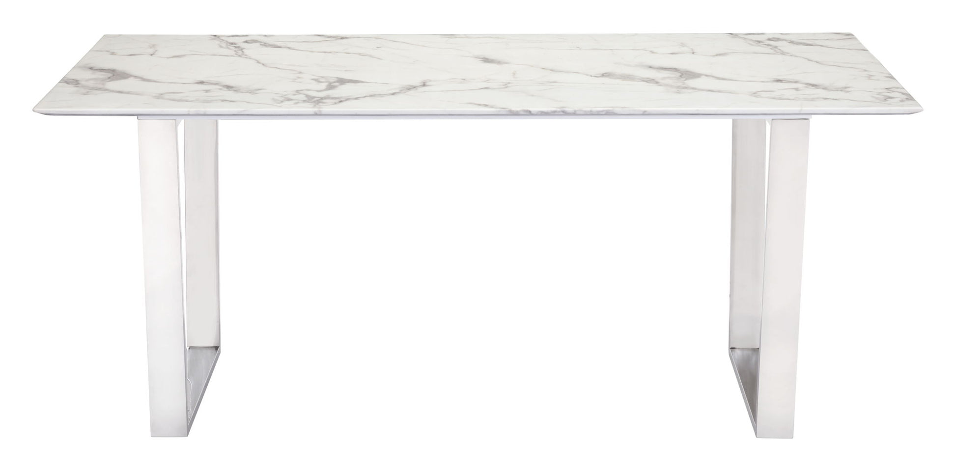 On-trend and decidedly modern, this sophisticated dining table will be on every designer's list. Gorgeous from every angle, the rectangular faux marble top seems to float atop its simple geometric base. Seats four comfortably, with room on either end for an additional chair.