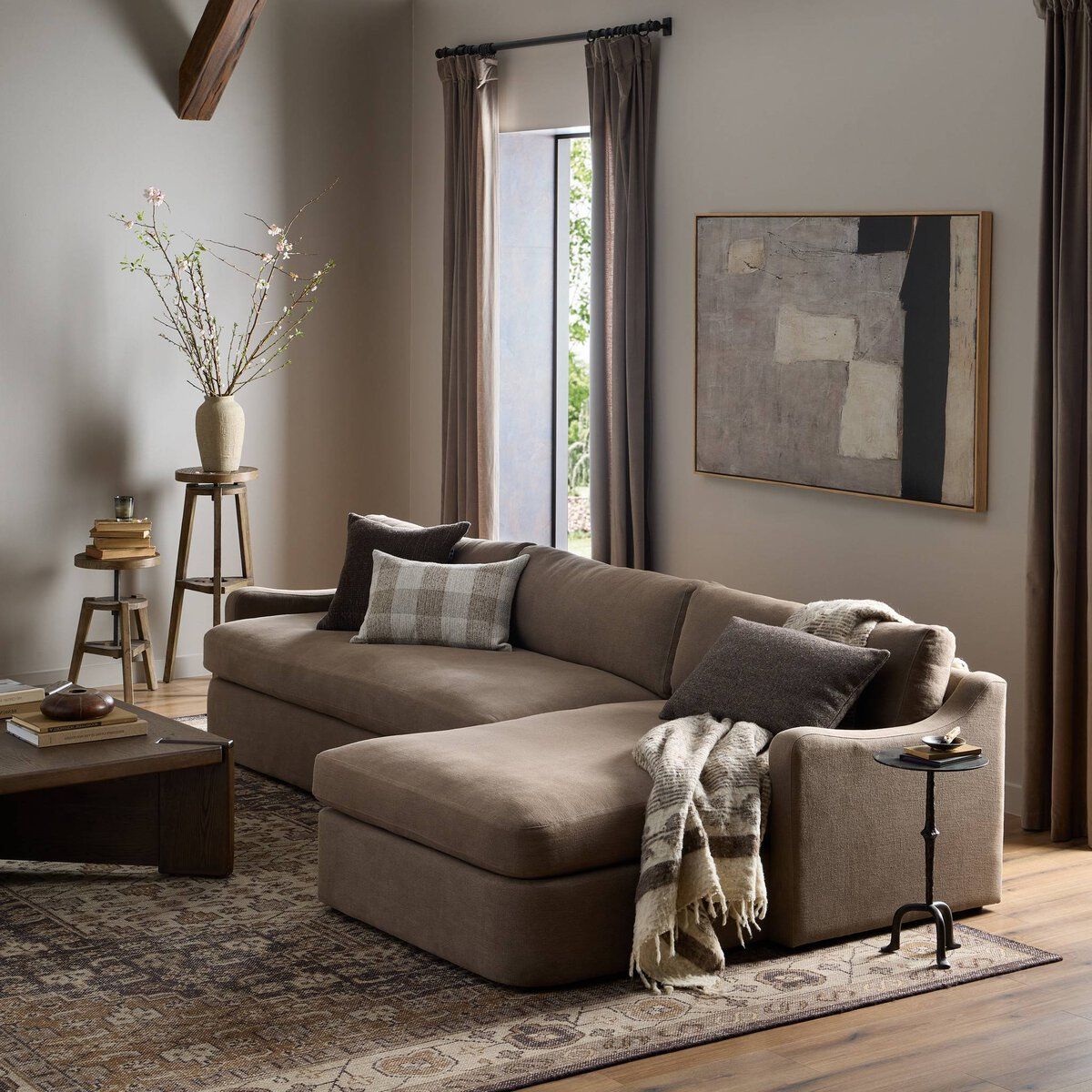 Heritage influence meets relaxed sophistication in this thoughtfully proportioned two-piece sectional from Four Hands. Sloping track arms and elongated front decking introduce a sense of playful geometry, while subtle boxing along the front perimeter refines the silhouette with a tailored, composed finish. The result is a design that feels both architectural and inviting.