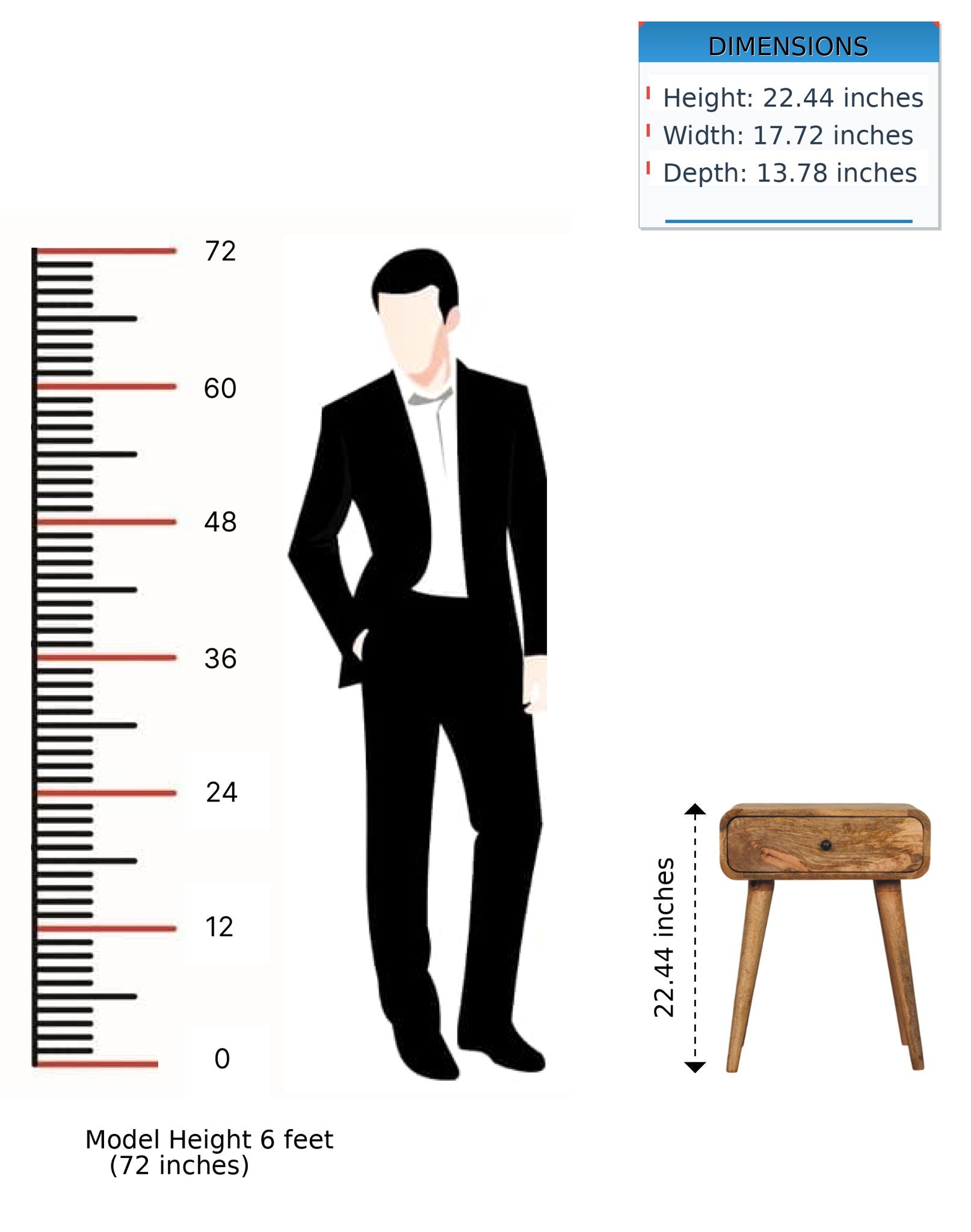 - Nightstand Solid Wood Avora with 1 drawer Artisan Furniture - Combining mid-century elegance with practical design, this bedside table is handcrafted from 100% Solid Mango Wood in a warm finish. Featuring a single drawer with a subtle knob for discreet storage, it rests on tapered Nordic-style legs that add a touch of retro charm. Perfectly sized for smaller spaces, this piece offers functionality and style, making it an ideal addition to bedrooms or living areas. Its handmade, sustainable craftsmanship and natural wood grain ensure that no two pieces are exactly alike, giving your home a unique and timeless accent.