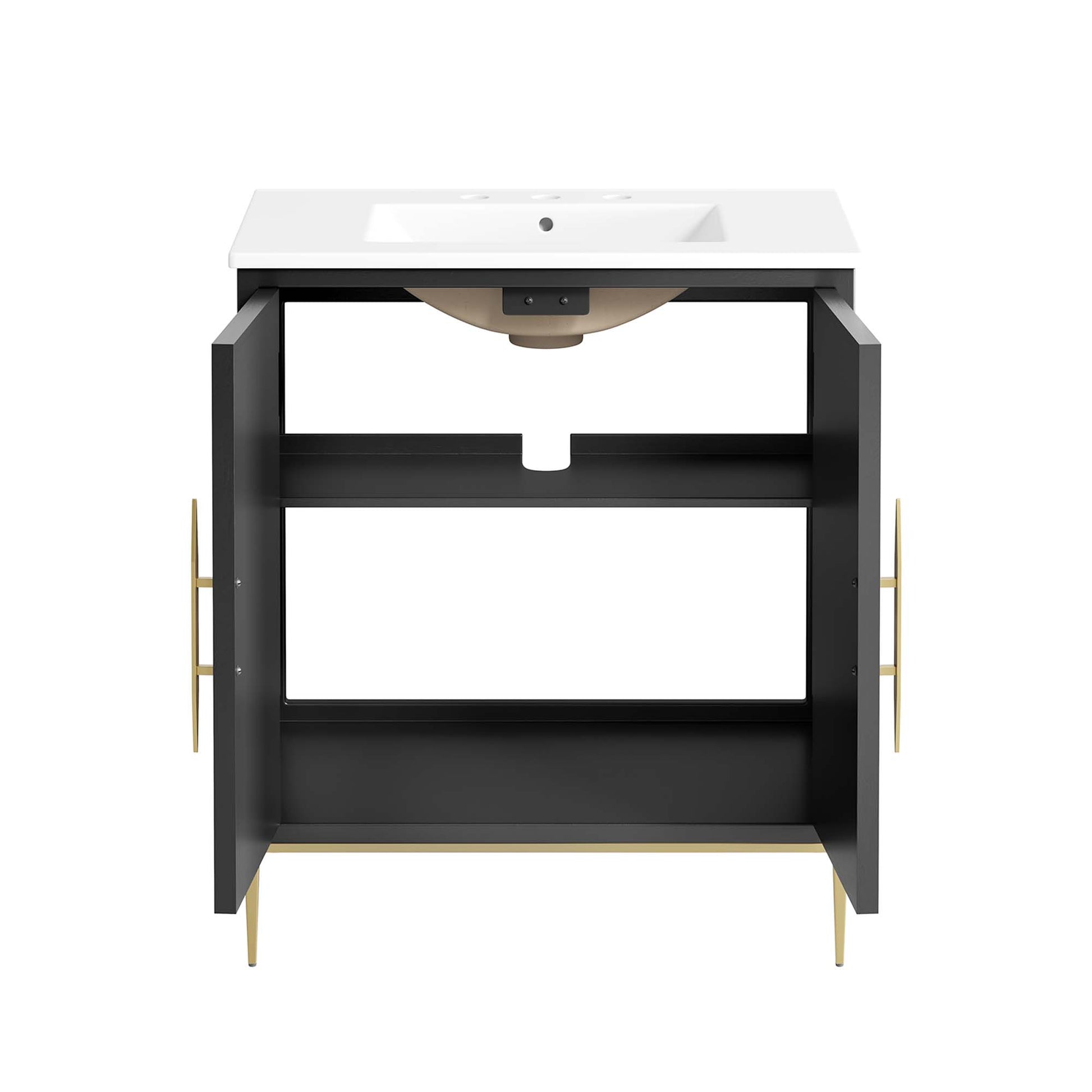 Intricate modernity radiates into your bathroom space with the Awaken 30" Bathroom Vanity. Showcasing clean lines arranged in a radial formation, this bathroom vanity is crafted with solid wood and MDF and rests on a gold base with non-marking foot pads to protect flooring. This vanity is a complete addition to a bathroom with a ceramic sink basin with an integrated countertop and 8" widespread holes. Offering ample storage space for bathroom essentials and more, this vanity cabinet features spacious shelves hidden behind detailed doors with sleek gold hardware. Fixtures not included. Assembly required.