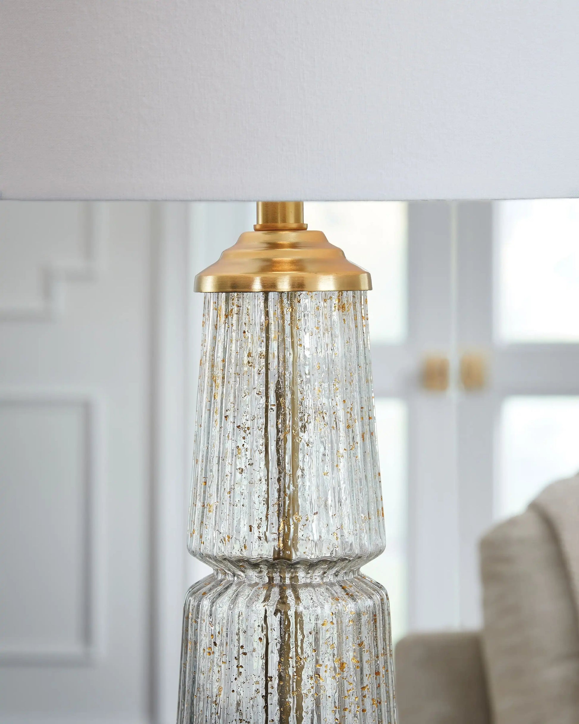The lighter side of traditional style. We love how the sheer simplicity of this lamp's clear fluted glass infused with subtle goldtone flecks creates a beautiful blend of timeless design. An instant classic, it's perfect for a cozy reading nook or a stylish living space.