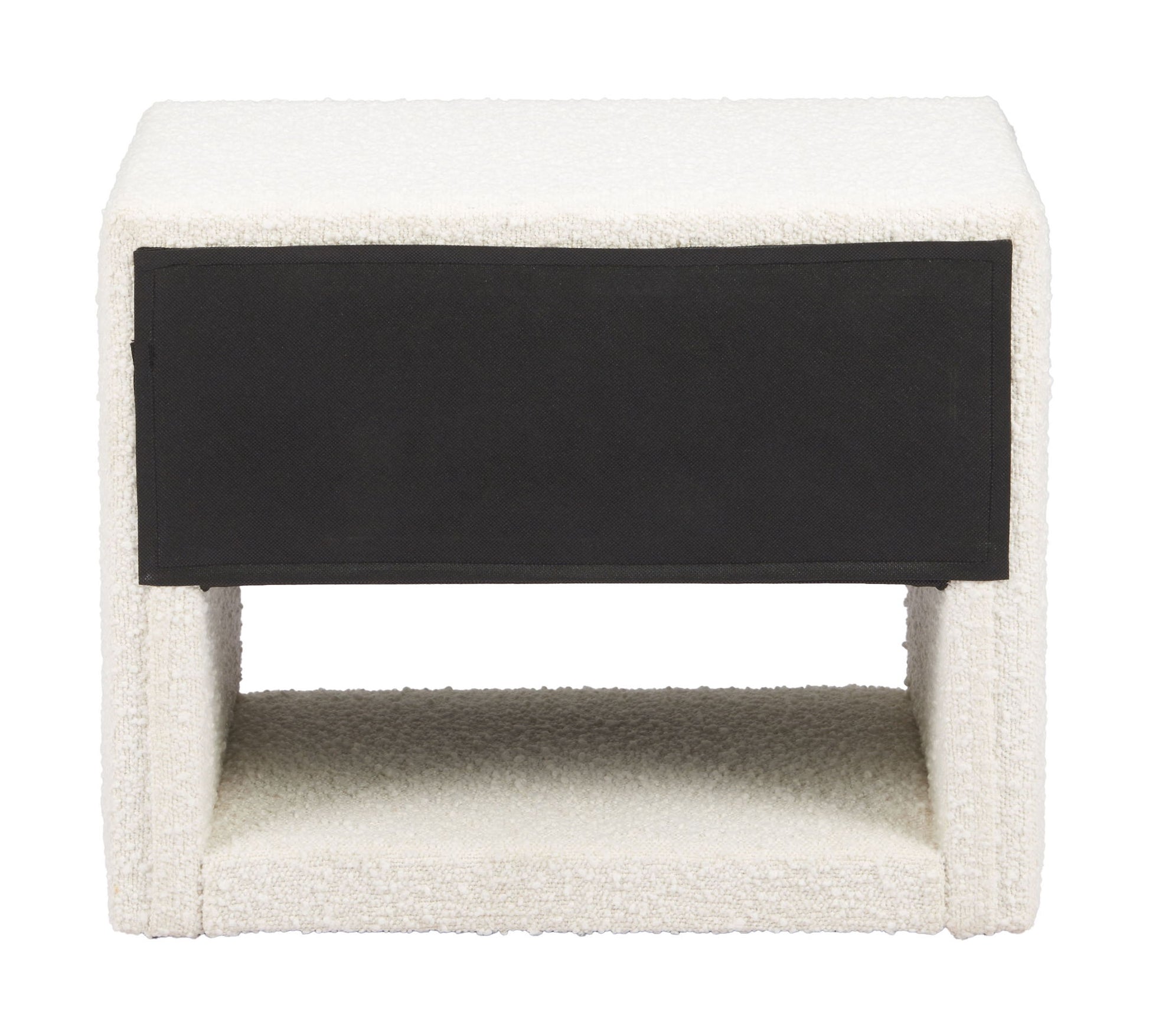 The Baris Nightstand Ivory brings a touch of modern elegance to any nightstand. Its Ivory tone and construction from textured fabric of 100% polyester, MDF, and 100% polypropylene ensure it stands out in any room. It is ideal for hospitality use, adapting to different spaces effortlessly.