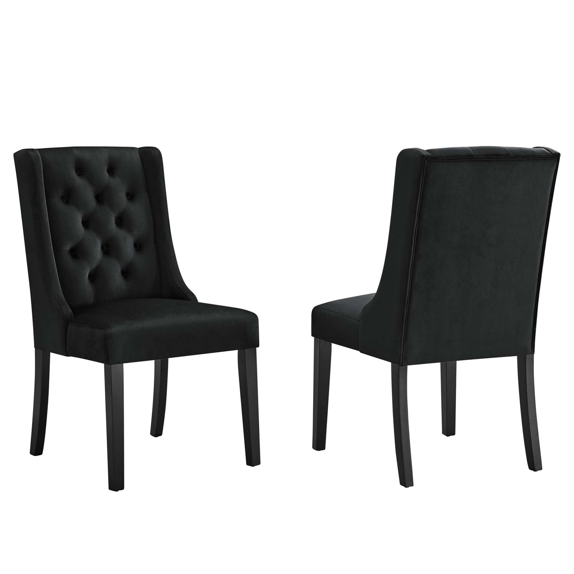 Bestow splendor with the Baronet Dining Chairs - Set of 2. Charm and elegance adorn these luxurious button tufted dining chairs complete with sleek curves and dignified form. Dense foam padding and a sinuous spring support system grant a premium seating experience. Featuring stain-resistant performance velvet upholstery, a solid wood frame, and non-marking foot glides, Baronet is a stylish dining chair set perfect for the modern home.