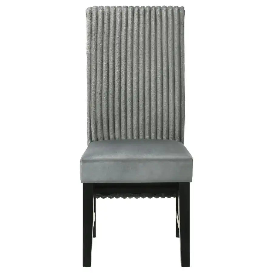 Elevate your dining space with these sophisticated dining chairs, blending textures and luxurious fabrics for a modern, elegant look. The seat back features wide channel corduroy upholstery, adding rich texture and a stylish visual contrast. The seat itself is covered in plush velvet fabric, ensuring a soft and comfortable seating experience. Supported by sturdy black-finished wooden legs, these chairs offer both durability and a sleek, contemporary silhouette. Whether for casual meals or formal gatherings, these chairs bring chic style to your dining area.