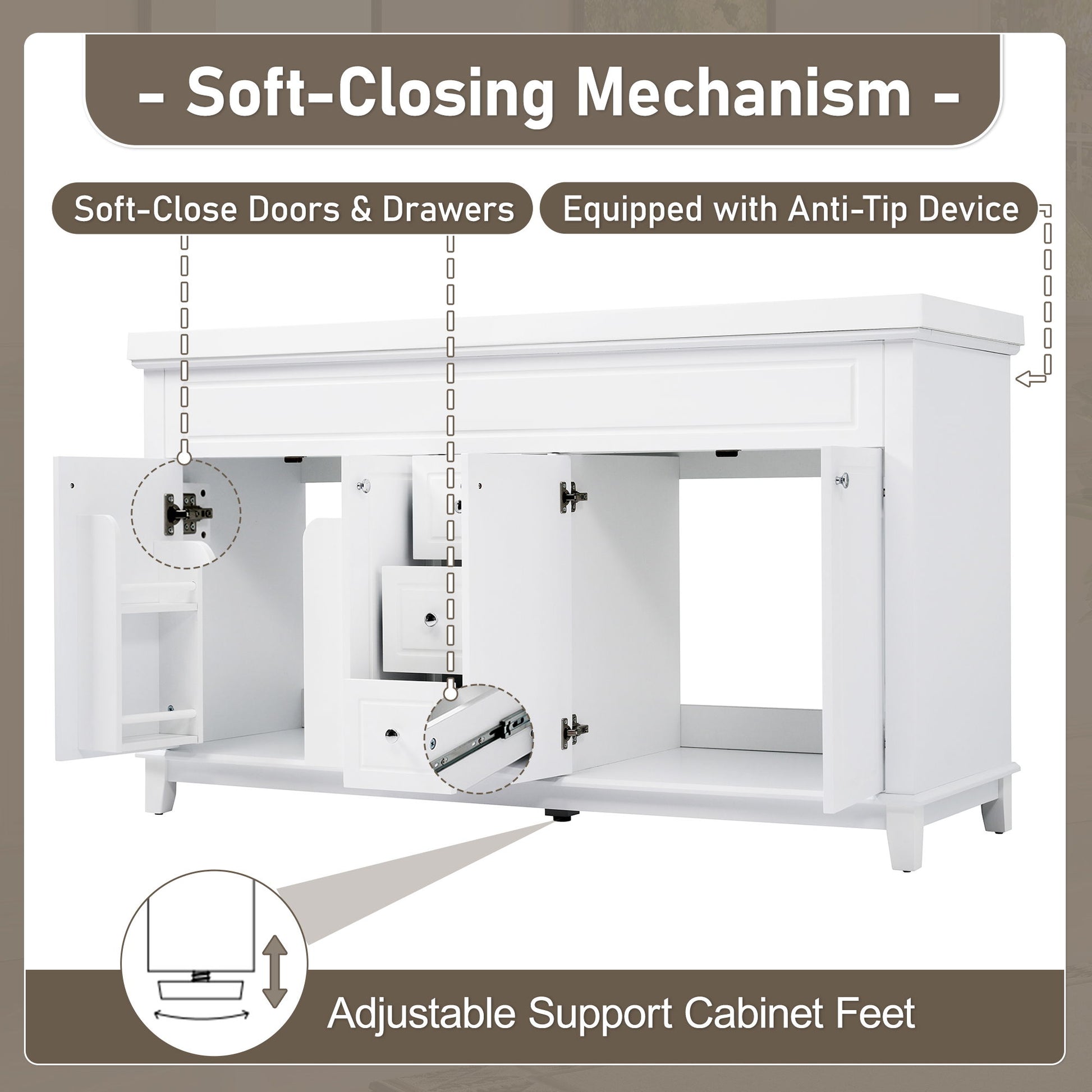 - Flexible Storage: 3 soft-close drawers and 4 doors with two-tier shelves offer versatile storage; shelves can be positioned left, right, or both sides.